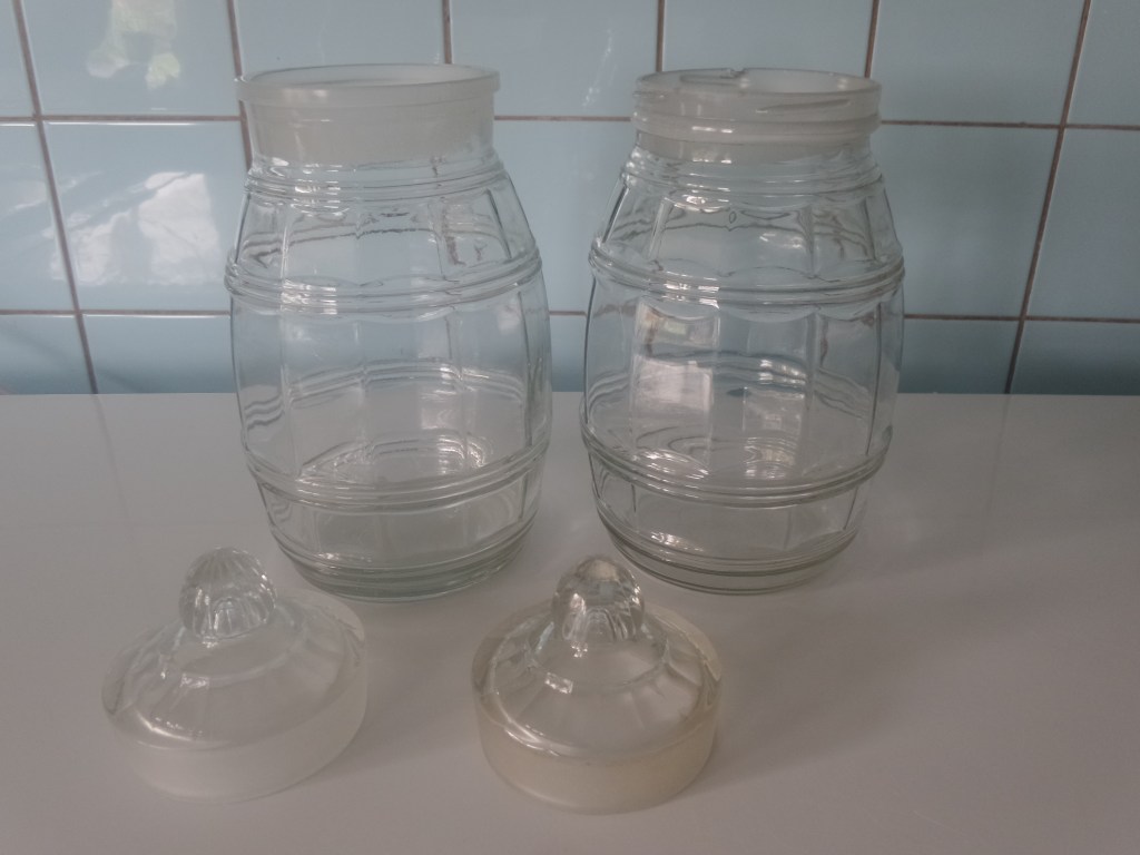 Bovenstaande foto laat de verschillen zien. De linker pot is was groter en de rechter pot heeft een schroefdraad bovenaan de pot. Wel hebben ze beide een zelfde soort stop. Alleen heeft de stop een ander formaat. De vraag blijft wel heeft de rechter pot een andere deksel gehad dan de stop die er nu op zit? Helaas mist de rechter pot een chip. Misschien dat deze daarom een klein prijsje had? Maar ook de andere pot was niet veel duurder…