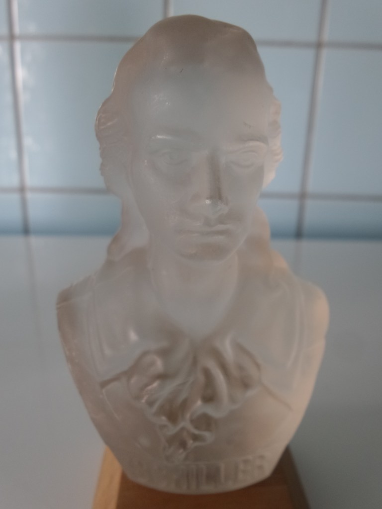 Vandaag een heel ander soort glasfiguur. Een borstbeeld van Schiller. Borstbeelden kennen we meestal als gebeeldhouwde werken. Van glas had ik er nog nooit één gezien. Ik kan nog nergens vinden waar deze glasfiguur op houten sokker is gemaakt.