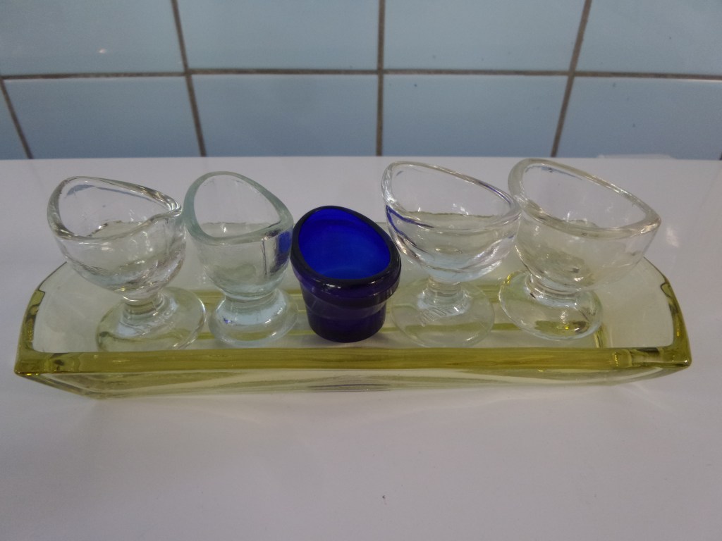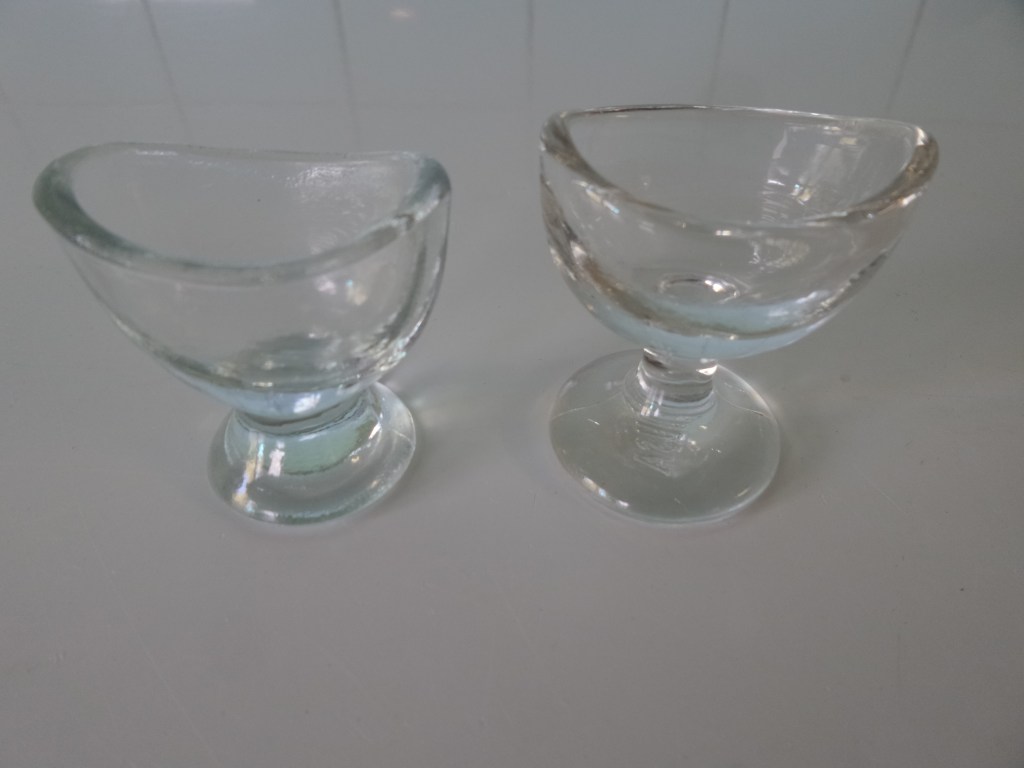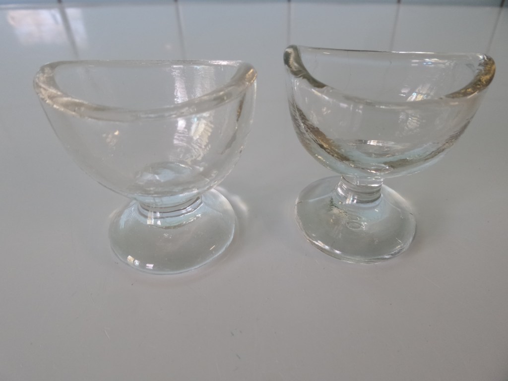 Afgelopen jaren heb ik een serie oogglaasjes bij elkaar verzameld. Deze glaasjes werden gebruikt om een oog te spoelen. Het bijzondere is dat ze lijken op eierdopjes maar het niet zijn. Vaak zijn ze dan bij de kringloop ook te vinden tussen de eierdopjes en de prijs is dan ook vaak van een eierdop. Zo tussen de € 0,25 en € 0,50 in.