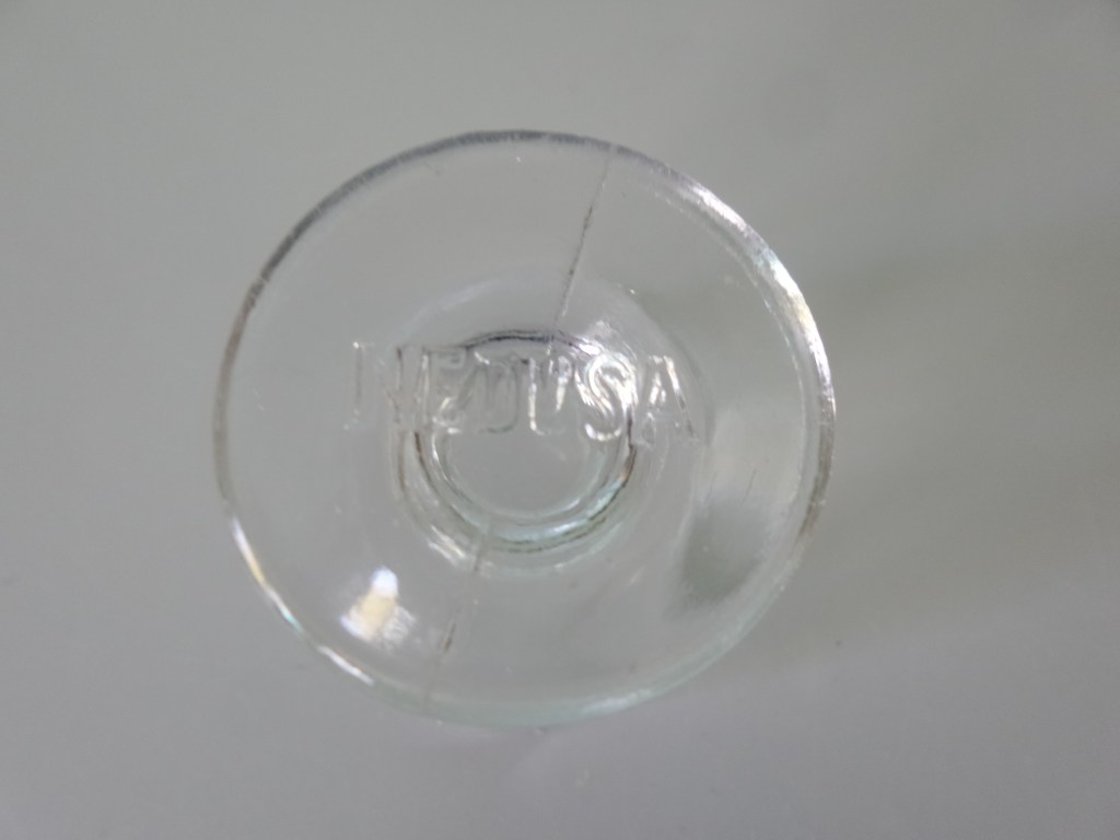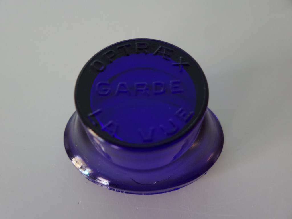 De donkerblauwe heeft een wat andere vorm maar is ook een oogglaasje. Vorige week zag ik op marktplaats een blauw flesje waar deze als een soort dop op hoort. Waarschijnlijk dat in het flesje dan de druppels die gebruikt moesten worden.