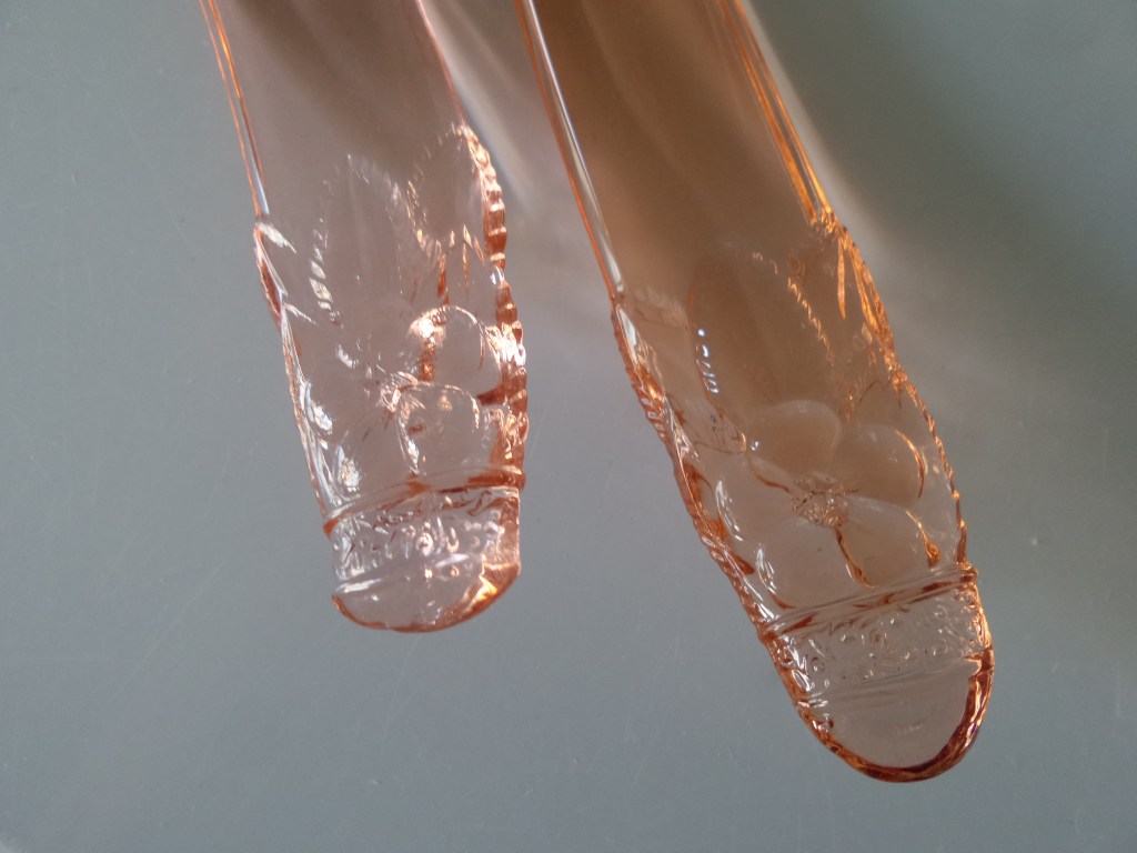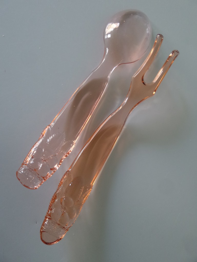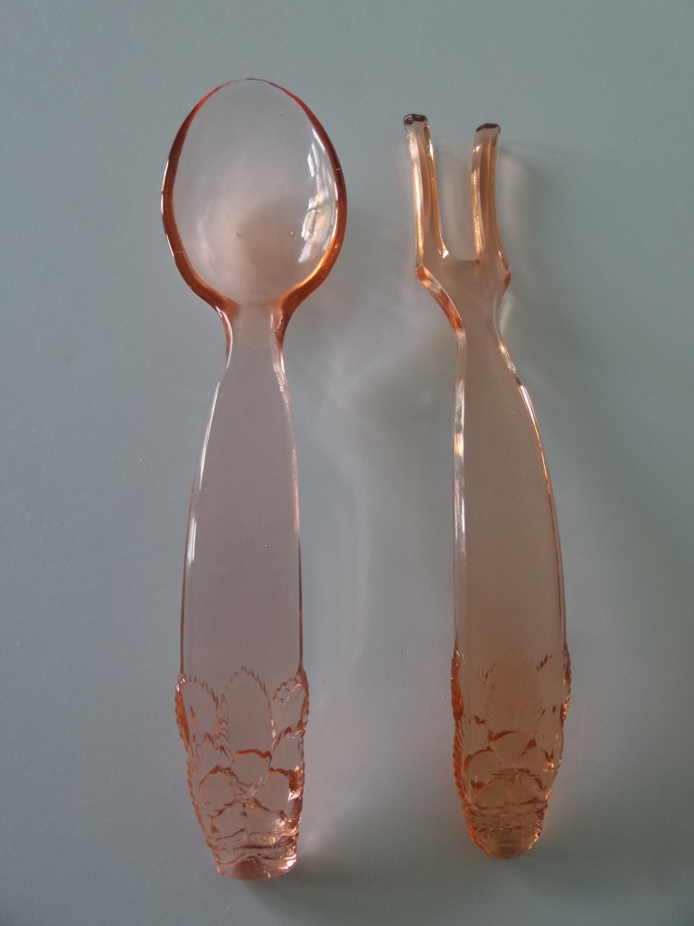 Dit slabestek is niet van al te beste kwaliteit. Het roze glas heeft een verschillende kleur. Het reliëf op het uiteinde is wel prachtig met het bloemmotief, maar het uiteinde van de vork en lepel zijn verschillend.
