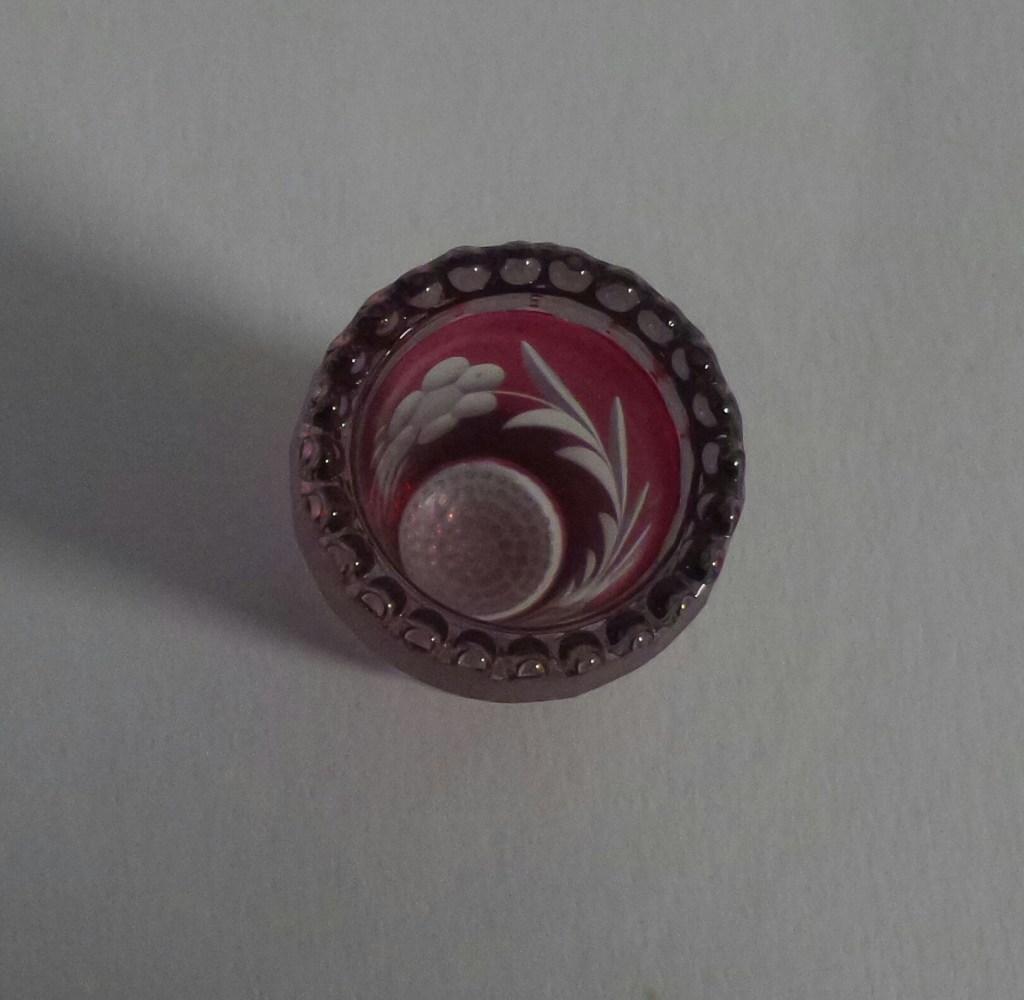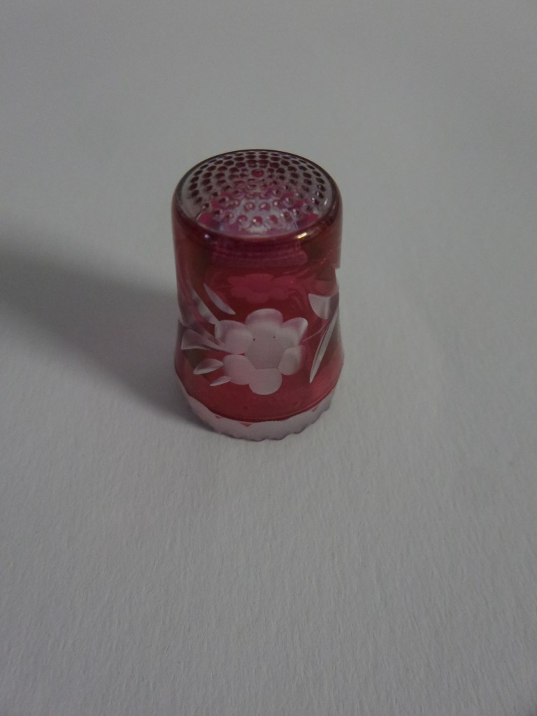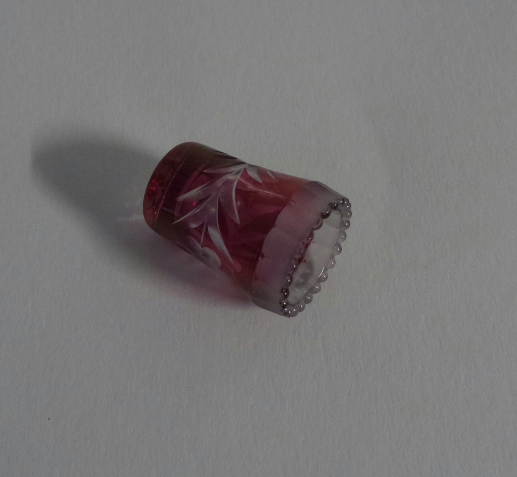 Ik wist niet dat ze bestonden, maar ze bestaan echt, vingerhoeden van glas. Tijdens mijn gegoogle kwam ik deze op het spoor. Ook gemaakt van uberfang/overlay glas. Dit soort glas staat echt bekend als Boheems glas. Iedereen heeft wel eens van die over de top geslepen glazen en karaffen gezien in doorzichtig kristal met rood of kobaltblauw uberfang. Het is niet het soort glas wat ik echt mooi vond. Maar een vingerhoedje in de verzameling is een mooi item om het te laten zien.