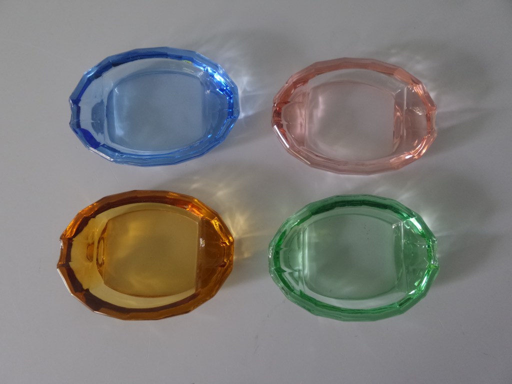 Deze kleurrijke persglazen asbakjes vind je niet vaak meer compleet met doosje. Ook vier tegelijk vinden is al moeilijk. Ik denk dat er heel wat asbakjes tijdens een fanatiek kaartspel gesneuveld zijn. Ik had dan ook al wel eenlingen in mijn verzameling. Maar deze vond ik met een andere set niet ver uit de buurt en nog compleet met doosje.