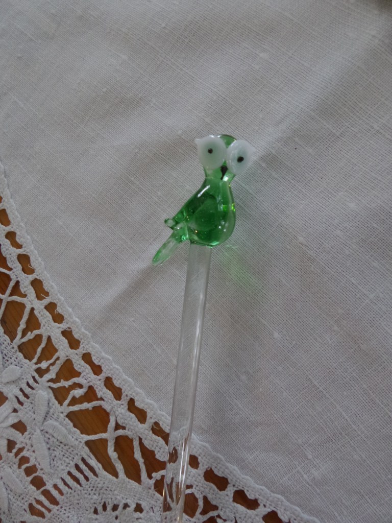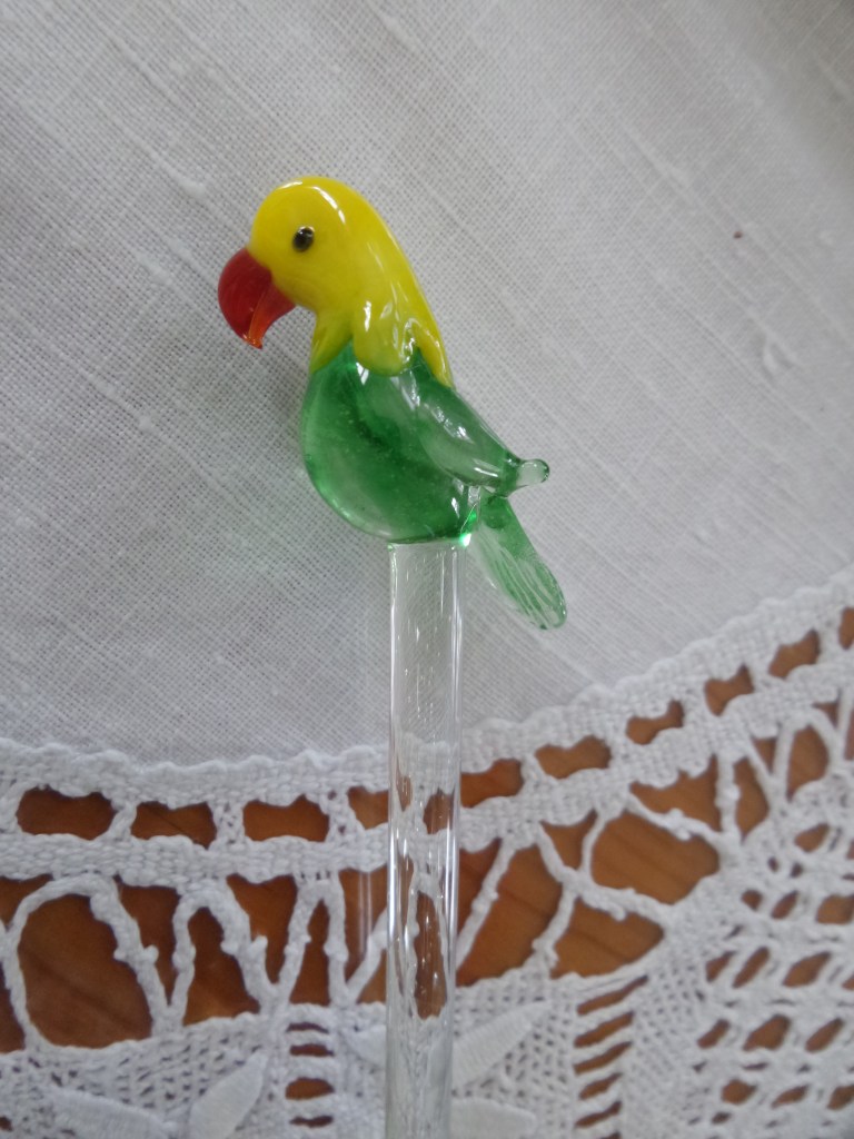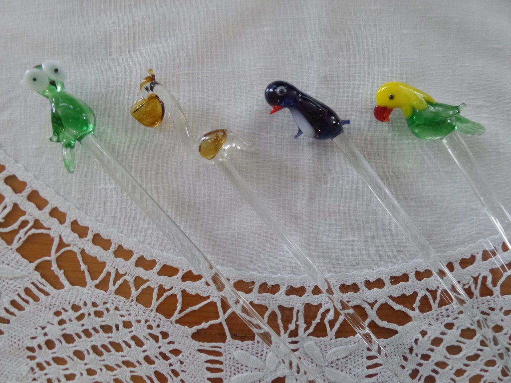 Behalve de glazen zaten er ook vier roestaafjes bij met elk een eigen vogel. Zo mooi gemaakt. Niet oud maar wel heel leuk!