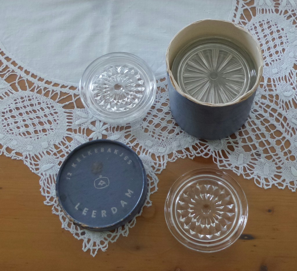 Van een andere vriendin kreeg ik een mooi origineel Leerdam doosje met kelkebakjes. Of zoals we dat nu zouden zeggen onderzetters. Waarschijnlijk heeft iemand ooit twee doosjes gehad en zijn er een aantal gesneuveld en hebben ze wat over was in één doosje gedaan. De kelkebakjes zijn van dezelfde grootte en dikte, maar drie hebben een ander motief.