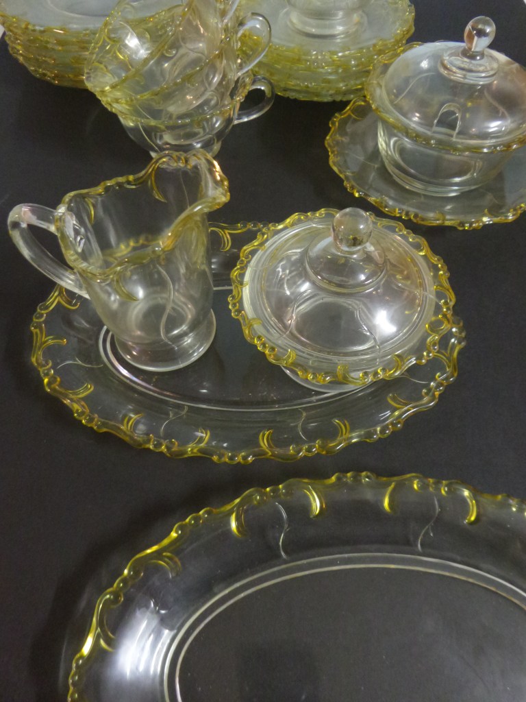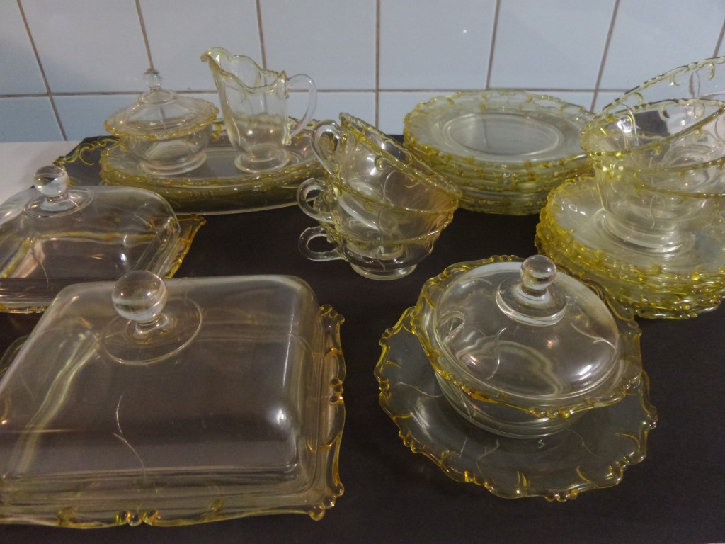 Soms vind je iets via Marktplaats wat vrij compleet is. Zoals dit mooie ontbijtservies uit de jaren ’30. Gekocht van iemand die wist dat zijn zijn opa en oma het hebben gekregen bij hun huwelijk in 1930. Het is vrij compleet. bestaande uit 6 kop en schotels, 6 ontbijtborden, twee vleesschaaltjes en een broodschaal, een jampot met onderschotel, een botervloot en kaasstolp en een suikerpot en melkkannetje. Het geel witte motief heet Barock.