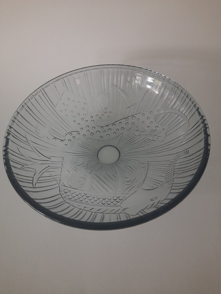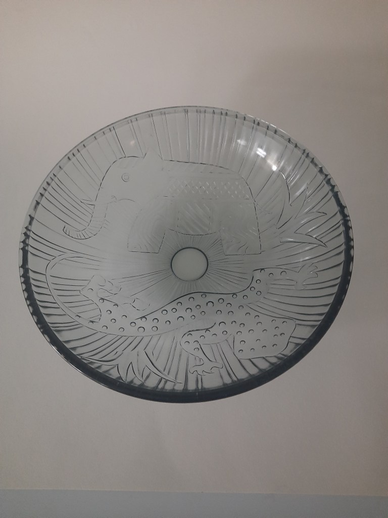 Op de foto’s is de persglazen safierblauwe schaal ‘Olifant en Salamander’ een ontwerp van Andries Copier uit 1948 te zien. Gemaakt in Leerdam. Deze schaal komt ook uit de collectie van Ivo. Ooit heb ik via marktplaats zo’n dergelijke schaal gekocht, maar deze kwam in stukken in Rekken aan. Heel erg jammer. Toen wij in Hamburg bij Pamela Wessendorf waren, heb ik haar gevraagd of zijn ook Leerdams glas had. Toen kwam uit haar verzameling ook de ‘Olifant en Salamander’ tevoorschijn. Toen ik haar vertelde dat die van mij in stukken aan was gekomen, opperde ze dat ik haar exemplaar mocht erven. Maar uit de dozen van Ivo kwamen zelfs 2 exemplaren. Dus ben ik nu voorzien.
