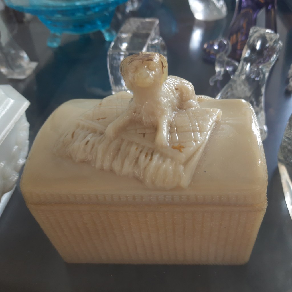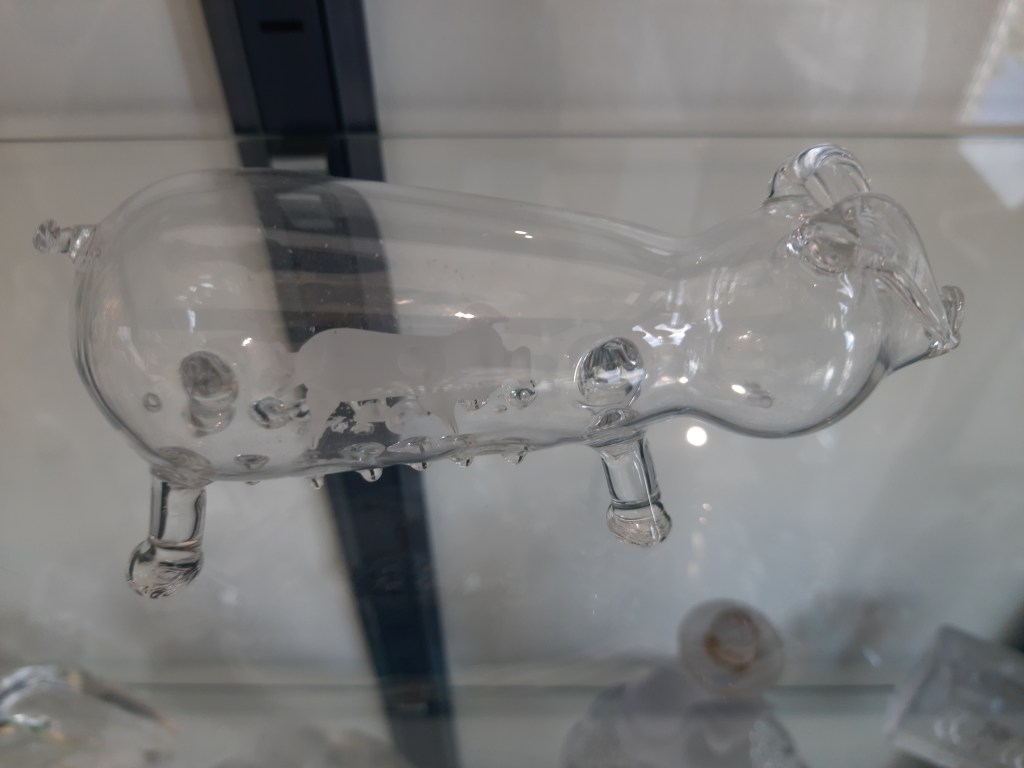 Zo kreeg ik ooit een varken met big in haar buik, een dikke muis en een bijzondere Egyptische kat. Maar ook het doosje met hond (gekregen van Pamela Wessendorf van pressglas-pavillon.de) mag niet ontbreken in deze mini-tentoonstelling. We hebben haar bezocht tijdens onze vakantie Duitsland-Denemarken. Wie van glas houdt en ooit in de gelegenheid is om naar Hamburg af te reizen kan met haar een afspraak maken om haar collectie te bezichtigen. Je weet niet wat je ziet!
