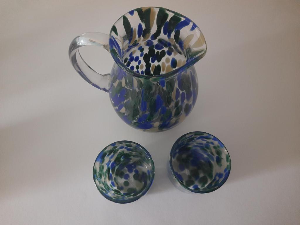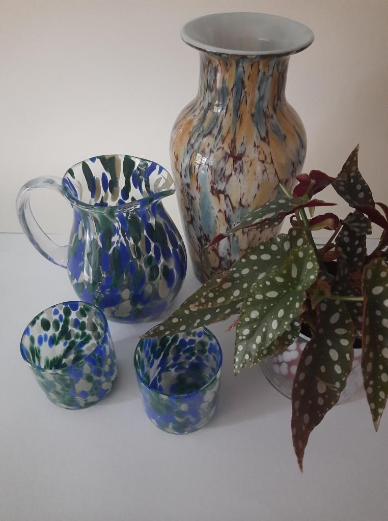 Ik probeer altijd iets van glas mee te nemen als ik ergens op vakantie ben. Zo waren we in april in Denemarken om de tentoonstelling Labyrinten in het glasmuseum van Ebeltoft te zien. We hebben er ook een dagje Arhus aan vast geknoopt. Daar liepen we een grote H & M binnen. Niet om kleding te scoren maar om te kijken welk serviesgoed ze onder hun merk verkopen. Daar kwamen we een prachtige waterkan met waterglazen tegen. Mondgeblazen glas met een kloddertje hier en een kloddertje daar. Lijkend op het oude spatterglas. In mooie kleurstellingen. Aan het einde van de dag zijn we teruggegaan en hebben een waterkan met twee glazen uitgezocht. Dat is het mooie van zelf kijken en voelen. Omdat elk stuk dat mondgeblazen glas is anders is, hebben we een mooi bijelkaar passend stel gevonden. Dat staat sinds april al te pronken op onze keukentafel.