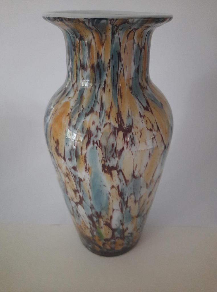 Maar van het één komt het ander. In augustus hebben we met vrienden een fietstocht gemaakt van Trier naar Koblenz. Elke keer als wij samen op pad gaan komt het wel ter sprake of ik nog iets van glas kan vinden. Onderweg kwamen we een trödelplekje tegen, maar er stond geen mooi glaswerk in. De verdere fietstocht hebben we ook niet wat gezien. Maar op de laatste dag toen we met de trein terug zouden reizen van Koblenz naar Trier, liepen we langs een bloemenwinkeltje, heel dicht bij het station. Buiten stond een stelling met vazen en bloempotten voor de helft van het geld. We liepen er in sneltreinvaart langs om naar het station te gaan. Maar mijn ogen hadden wel wal wat moois gezien. Eenmaal in het station, kaartjes gekocht en toen begon het wachten op de trein. We waren erg vroeg en ik schatte in dat ik nog wel een keer heen en weer naar het bloemenwinkeltje kon. Zo gezegd, zo gedaan. Met twee vazen rijker en een rugtas die een stuk zwaarder was geworden, aanvaarden we de treinreis naar Trier. Gelukkig konden we in Trier met de bus naar de parkeerplaats van de auto. Dat scheelde een hoop gesjouw. Eén van de twee vazen heeft wat meer een kloddertje hier en een kloddertje daar. Die kwam bij het waterstel op de tafel te staan.