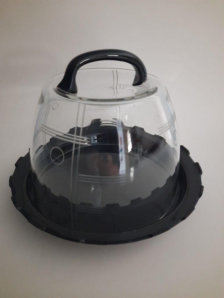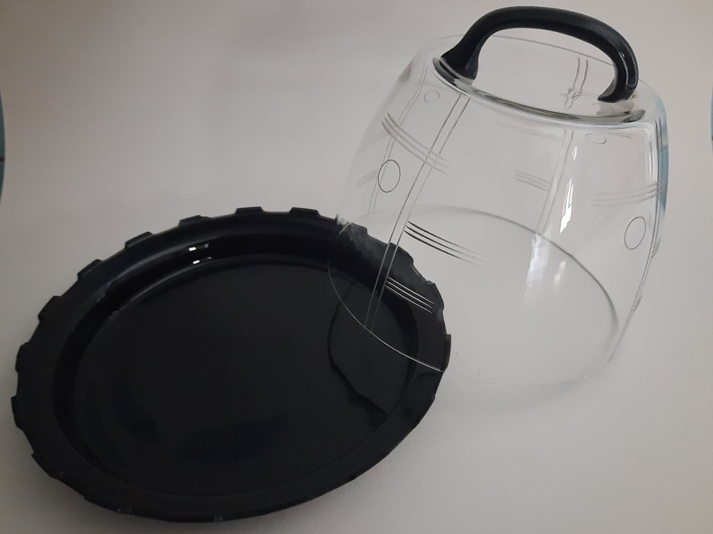 Dit is mijn laatste aanwinst. Gekregen van iemand die glas ook een warm hart toedraagt. Dank Annelies! Deze heeft dezelfde kenmerken dan het andere glas op de plank, doorzichtig geslepen glas met zwarte accenten. Een heel bijzondere kaasstolp, ik heb nog nooit zo’n vorm gezien. Dus wat de herkomst is blijft onduidelijk. Het enige wat ik zeker weet is dat men glas in alle kleuren van de regenboog kan maken, maar geen zwart glas. Dit glas lijkt dan wel zwart, maar het is gemaakt van heel donkerpaars glas. Alleen goed te zien als je het in 1000 stukken gooit. Maar dat raad ik niemand aan.