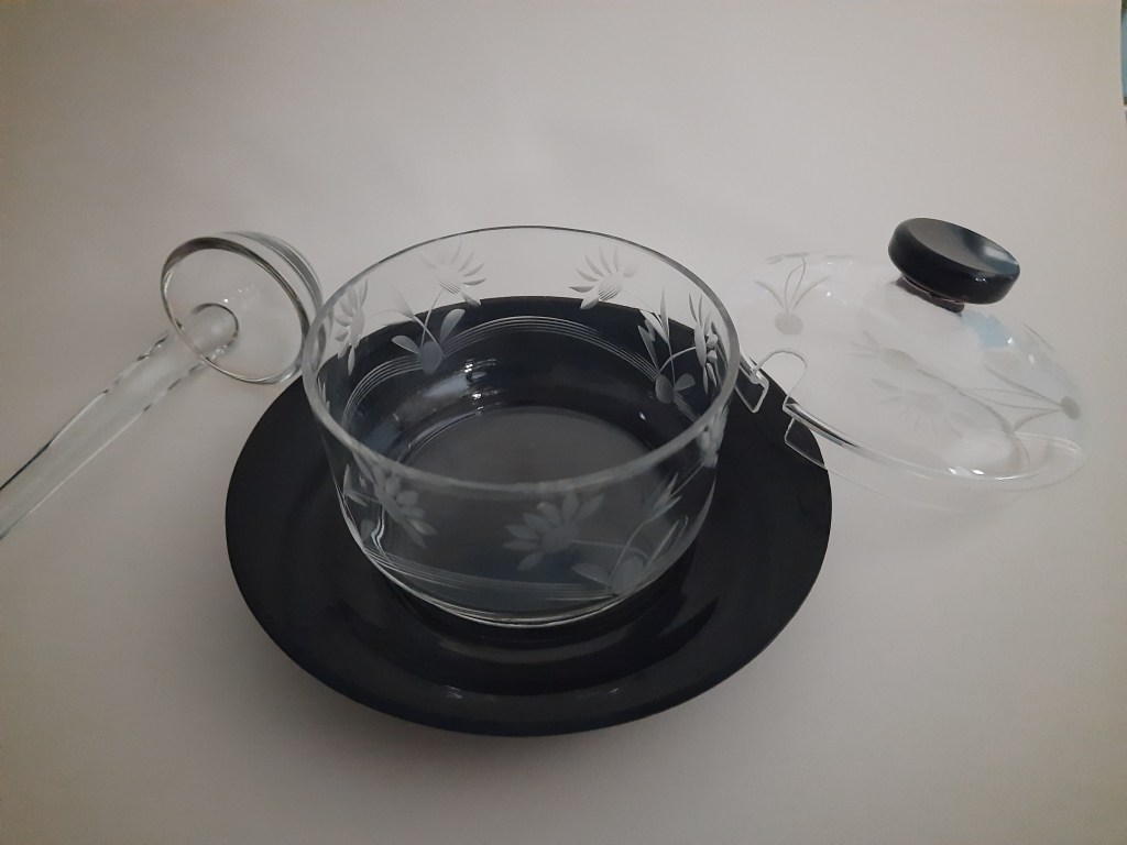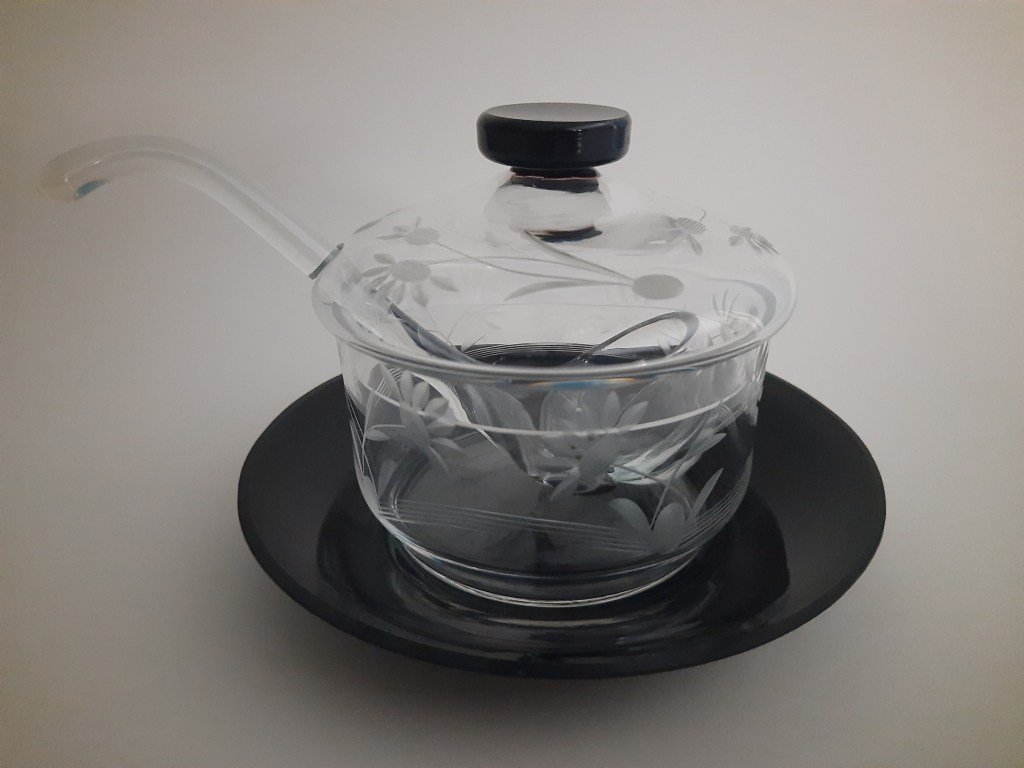 Zeker niet onbemind. Ik heb in het glasmuseum een plank vol met glaswerk dat de overeenkomst heeft dat het allemaal doorzichtig geslepen glas is met een zwart accent. Zoals bovenstaande jampot. Het was nooit mijn verzamelgebied geweest tot ik een keer twee van dergelijke jampotten en een beschuitbus tegen kwam. De jampotten zagen er hetzelfde uit, alleen het geslepen motief was anders. Ook hebben beiden een glazen lepel. Hoewel ik de glazen lepel voor een jampot wel erg groot vindt.