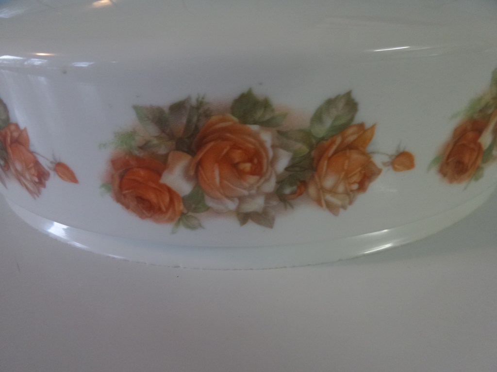 Deze twee foto’s hierboven laten een beetje zien van wat ik toen op die Oranjemarkt kocht. Alleen de theepot die op de foto staat die heb ik later bij een kringloop op de kop getikt. Dat is best bijzonder want in alle boeken over Anchor Hocking komt geen theepot in voor. Deze theepot is namelijk ook niet van glas maar van een soort porselein. En is al helemaal niet gemaakt in Amerika maar in Duitsland. En toch horen ze bij elkaar. Aan de vorm en kleur is dat goed te zien, maar het heeft aan de onderkant ook het merk van Anchor Hocking meegekregen. Of deze nu voor de Europese markt of voor de Amerikaanse markt is gemaakt. Ik weet het niet. Behalve mijn theepotten (ik heb er twee) heb ik ze nog nooit gezien. Niet op internet, niet in boeken, nergens. Dus wie het weet mag het zeggen!