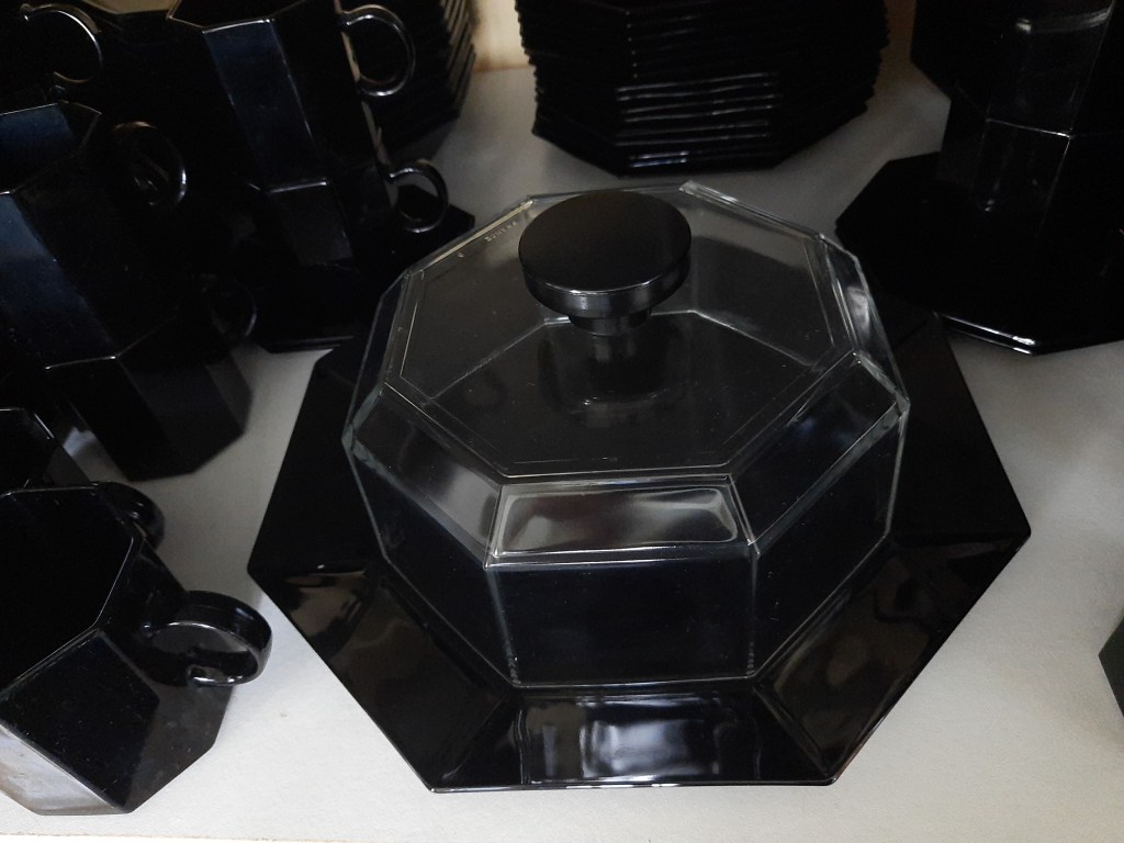 Zeker niet onbemind. Ik heb in het glasmuseum een plank vol met glaswerk dat de overeenkomst heeft dat het allemaal doorzichtig geslepen glas is met een zwart accent. Zoals bovenstaande jampot. Het was nooit mijn verzamelgebied geweest tot ik een keer twee van dergelijke jampotten en een beschuitbus tegen kwam. De jampotten zagen er hetzelfde uit, alleen het geslepen motief was anders. Ook hebben beiden een glazen lepel. Hoewel ik de glazen lepel voor een jampot wel erg groot vindt.