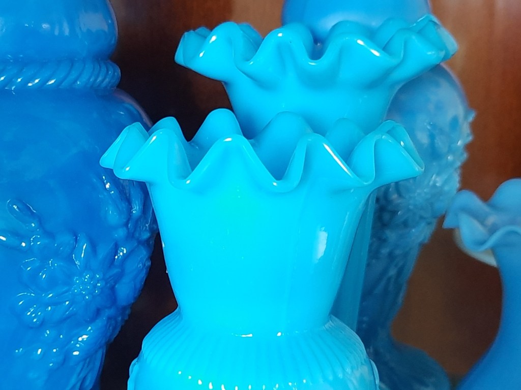 Ook deze glazen set kwam ik bij dezelfde kringloop tegen. Mooi facetgeperst kobaltblauw glas. Van dit motief heb ik verschillende opaline glazen in verschillende maten. Nu nog op zoek naar de oorsprong van dit glaswerk. het kan namelijk uit Italië komen, maar ook wel uit Frankrijk, gezien de opaline glazen die ik ervan heb. Maar deze kobaltblauwe kleur is weer een echte Engelse kleur. Wie het weet mag het zeggen…