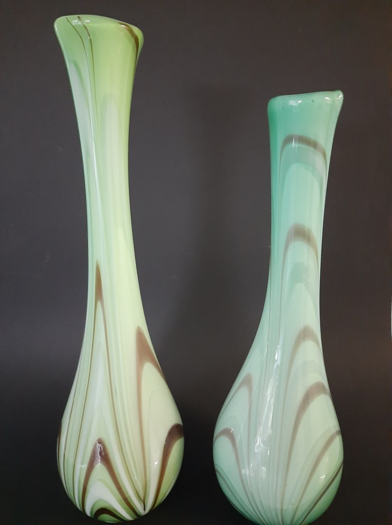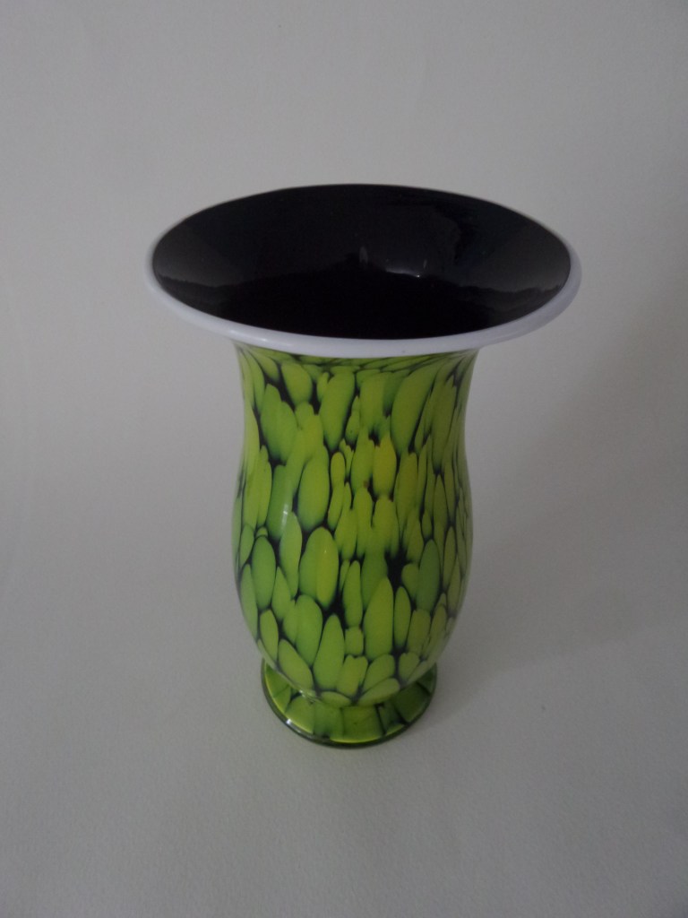De laatste vaas die ik mee kreeg is een heldere vaas met strepen. Meestal zijn de strepen op dergelijke vazen vervaagd door het veelvuldig afwassen. Maar deze had al zijn strepen nog. Rood, wit en glanzend zilver.