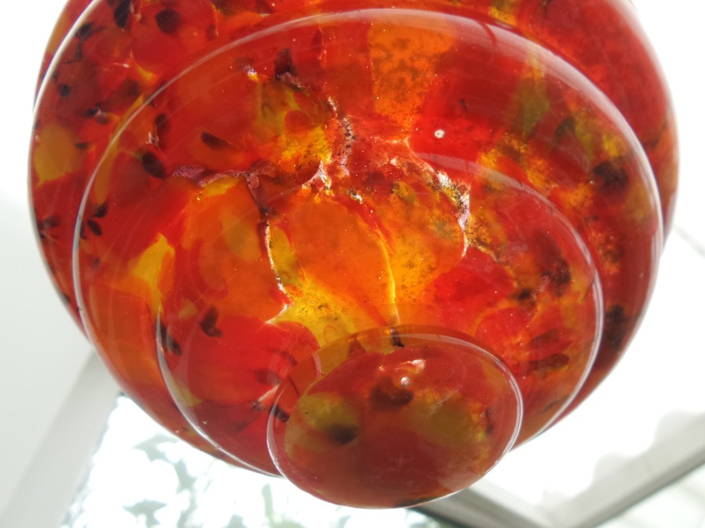 Het weekend ervoor waren we op vrijdagavond en zaterdag in Friesland omdat we daar wat modern glaswerk hadden gekocht, dat we gingen ophalen onder andere in Leeuwarden (waaronder ook een bolvormige vaas). Op de zaterdag hebben we er ook wat familiebezoeken bij aangeknoopt. Met de tante in Friesland deel ik de liefde voor glas. Ze had drie vazen voor me klaar staan, die mocht ik meenemen. Alledrie anders, maar alledrie in een mooie bolvorm en de moeite waard om hier te laten zien. Bovenstaande vaas is van okergeel transparant glas.