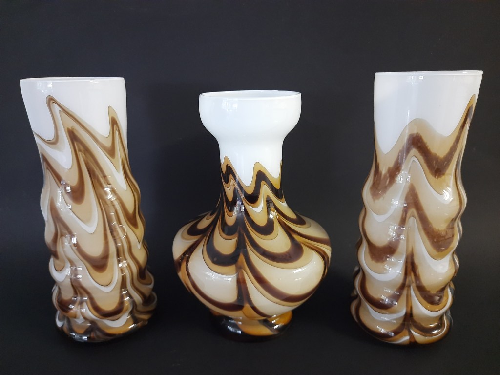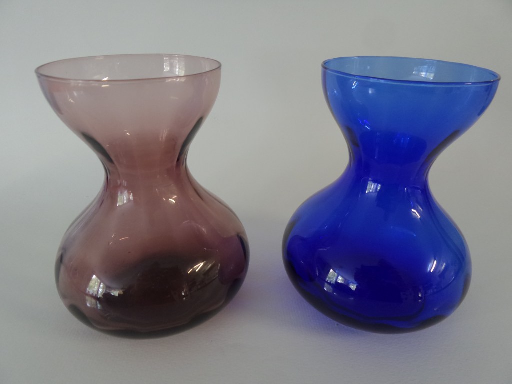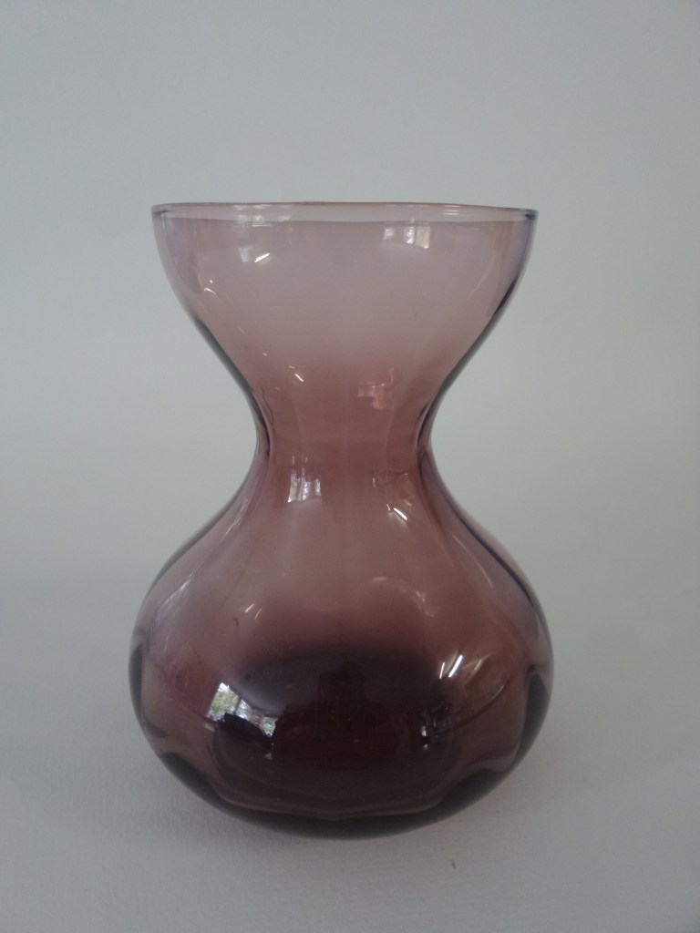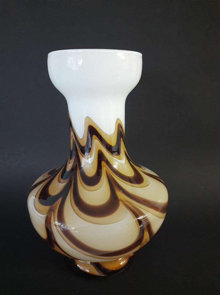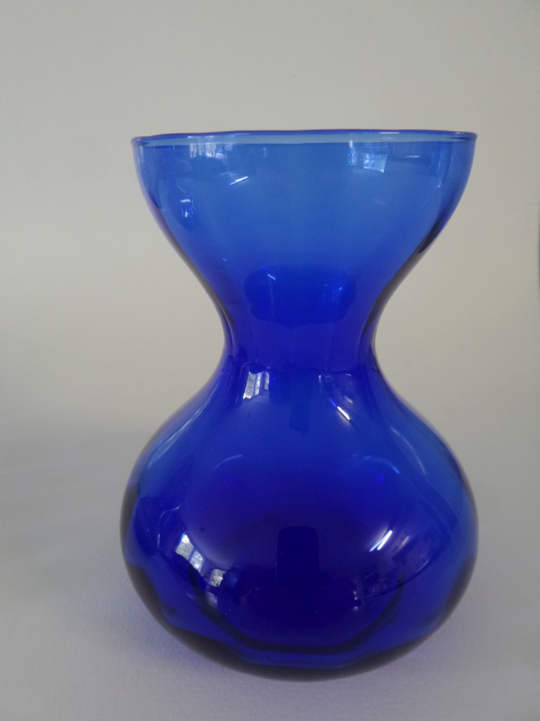 Deze ronde vaas met gelijkmatige ribbels lijkt zwart glas. Maar schijn bedriegt. Deze is van heel donkerbruin glas en ik heb een dergelijke vaas nog niet eerder gezien. Op onderstaande foto is de weerschijn van het bruin enigzins te zien.