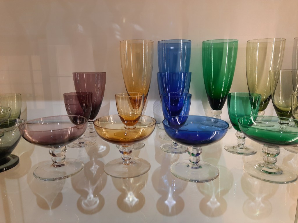 Ze had bedacht dat ze met de Valys taxi wel van deur tot deur naar het glasmuseum zou kunnen reizen. Prachtig plan! Wat ik zeer waardeer. Maar deze mevrouw telde inmiddels 89 jaren. Ik kan het niet over mijn hart verkrijgen dat iemand met zo’n hoge leeftijd 2X op een dag uren in de taxi moet zitten voor één museumbezoek. De afspraak werd gemaakt. In mijn vakantie zou ze met de Valys taxi naar Rekken komen, ze zou hier savonds de warme maaltijd gebruiken, overnachten en na het ontbijt (volgens het principe van vrienden op (zonder) de fiets) en de ochtendkoffie weer vertrekken naar huis. Zo gezegd zo gedaan. Deze kwieke dame is net zo gefascineerd door glas dan ik ben… Uit haar verzameling had ze enkele dubbele stukken meegebracht voor mij, te zien op bovenstaande foto.