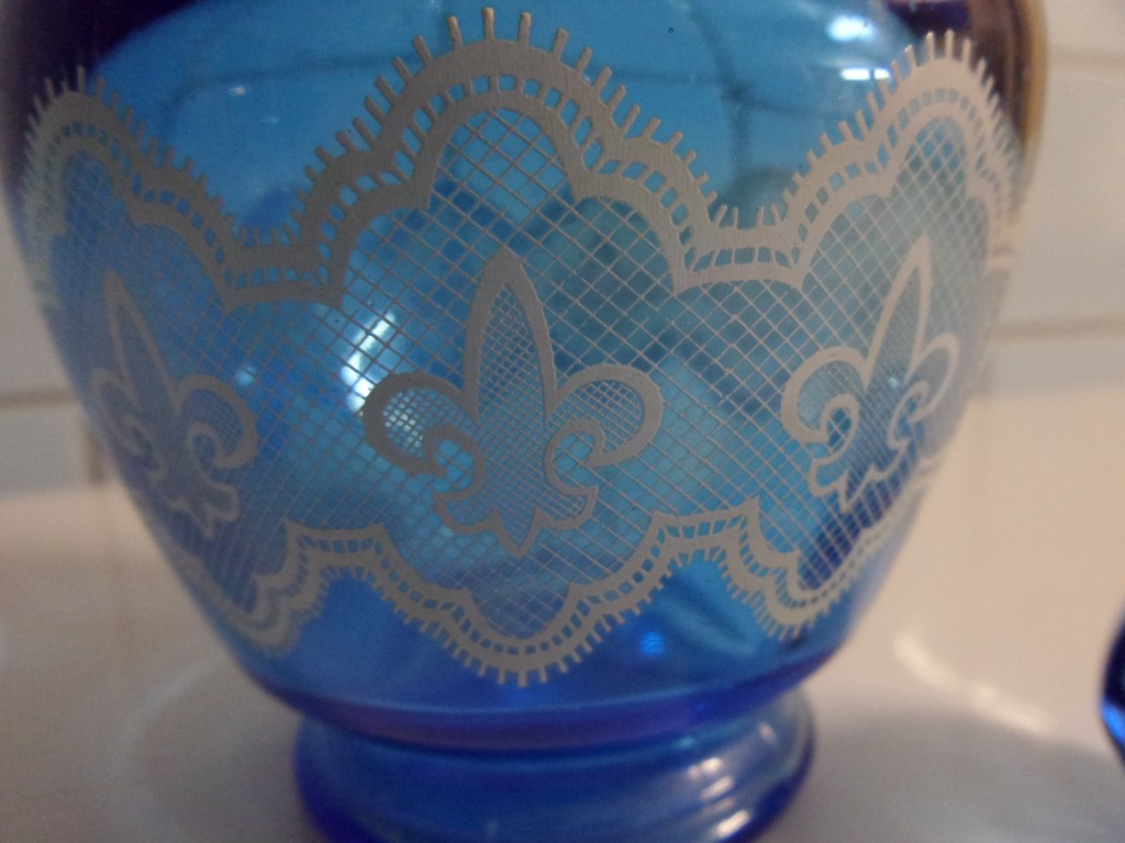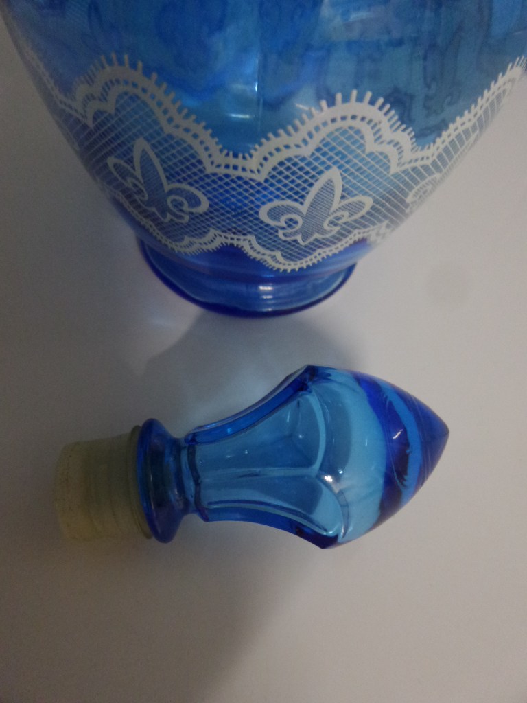 Af en toe kom je ze nog eens tegen. Dit soort mooie blauwe flessen bedrukt met een kantmotief. Soms in wit zoals deze, soms met goud. Ze hebben allemaal dezelfde overeenkomsten. Made in Belgium. Dat staat onderop mee geperst. En de stop heeft een plastic afsluitstuk. Het plastic kan verweerd zijn na verloop van tijd, stuk zijn of verdwenen.