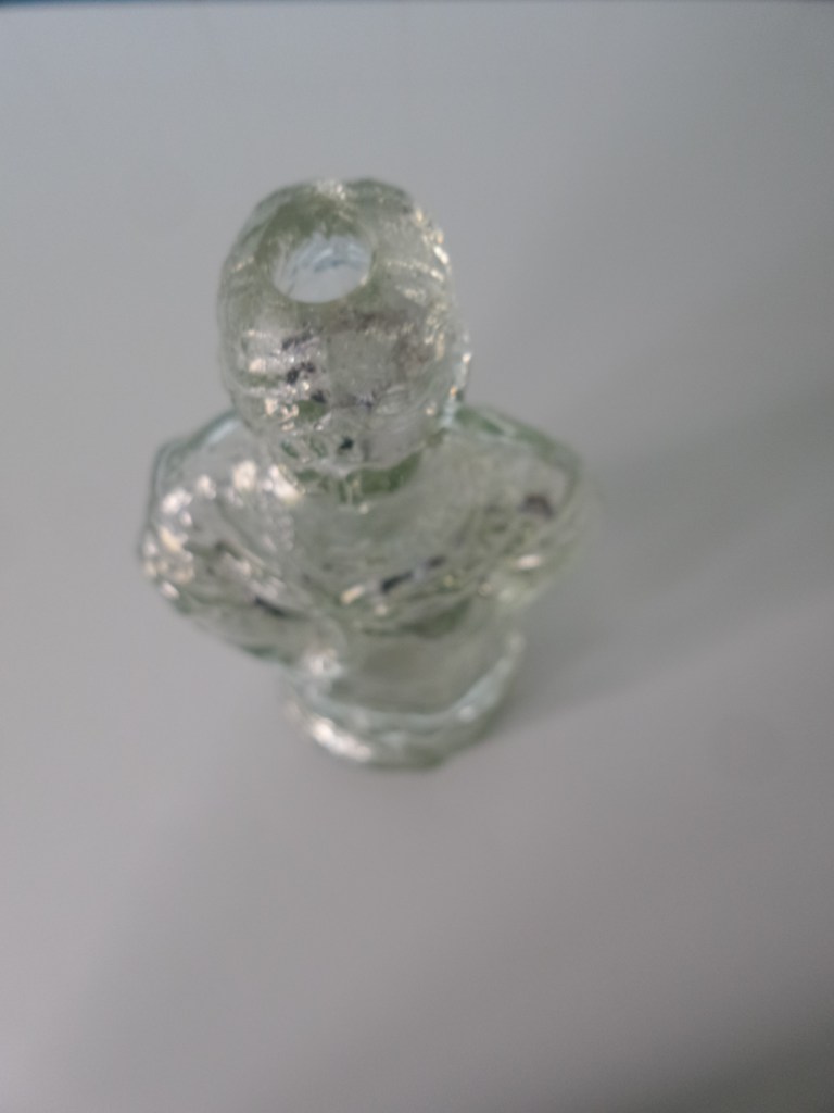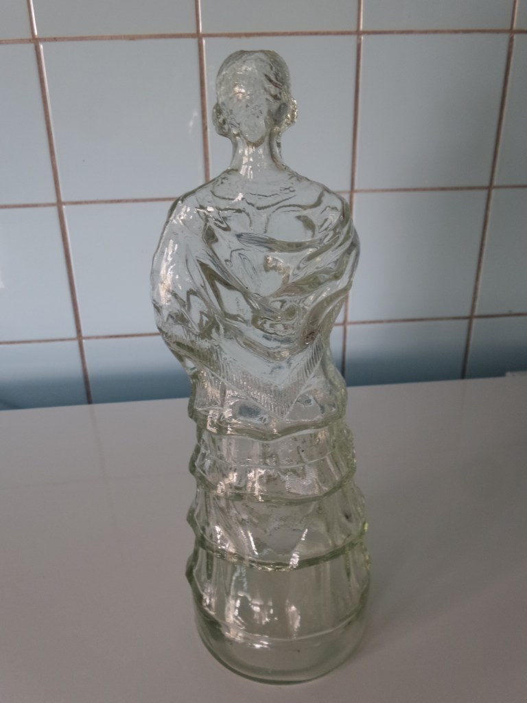 Vandaag een statige dame. Het is een kruising tussen een glasfiguur en een fles. ze heeft de vorm van een fles maar dan met toch een ietwat vreemde bovenkant.