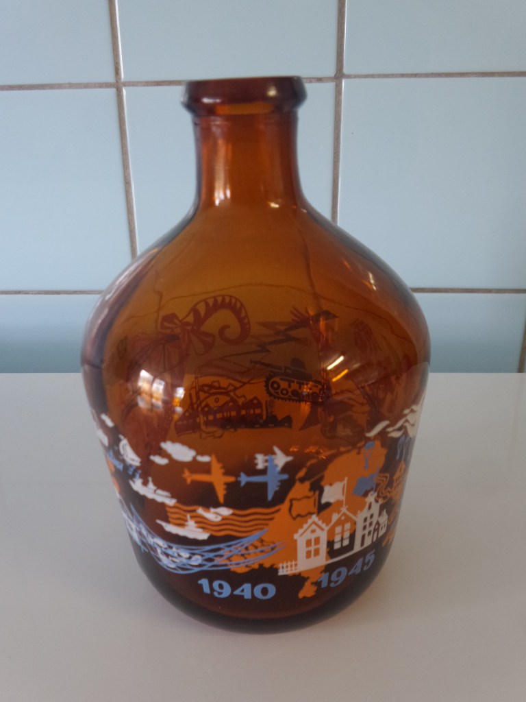 Deze periode herdenken we 75 jaar bevrijding. Helaas worden alle herdenkingen en festiviteiten nu afgelast door Corona. Maar daarom een eerbetoon aan alle mensen die mee hebben gewerkt aan de mogelijkheid dat wij nu in een vrij land wonen, vandaag deze fles. Hoewel deze eerste foto doet vermoeden dat deze 5 jaar na de bevrijding is gemaakt klopt het niet. Maar wel dat het een bevrijdingsfles is gezien de opdruk in oranje wit en blauw. Het eerste tafereel laat ons land zien in tijd van oorlog.