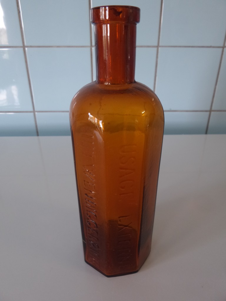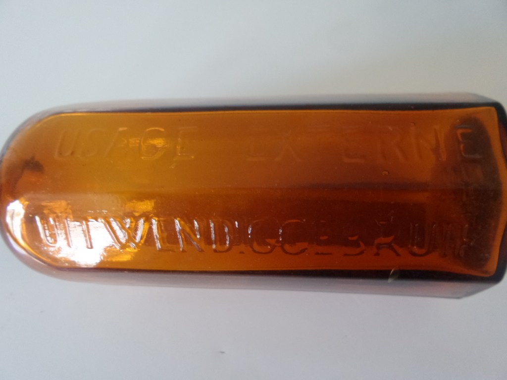 Vandaag nog zo’n mooie achtkantige fles. Qua grootte lijkt het me meer een fles voor hoestdrank of dropwater geweest. Maar dat zal er zeker niet in hebben gezeten omdat de inhoud voor uitwendig gebruik bedoeld is zoals in twee talen met de fles mee geperst is te lezen. Toch zal er wel iets wat medicinaal was in hebben gezeten. Het blijft voor mij een vraag en een mooie fles.