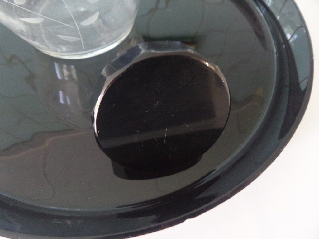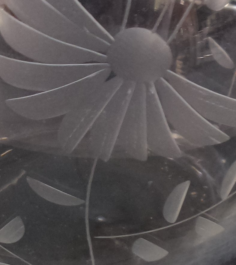 Ook dit karafje heeft mooi geslepen glas. Daarnaast heeft het ook een mooie zwarte stop. En komt het uit dezelfde aankoop als het glasservies. Dit motief is een ander bloemmotief.