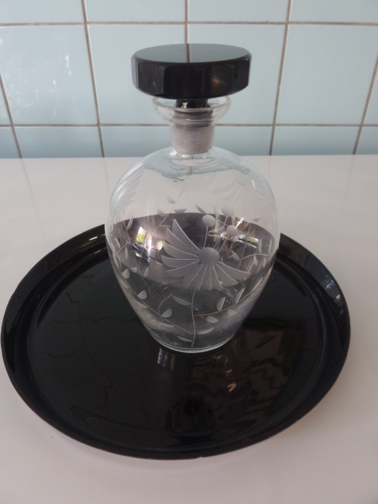 De karaffen en stopflessen zijn gemaakt in de jaren ’70. Maar in welke glasfabriek? Mij onbekend. In dezelfde periode kwamen vaak de glazen stopflessen uit Taiwan. Zo ook de kleine miniatuurflesjes voor in de letterbak, die toen in waren.
