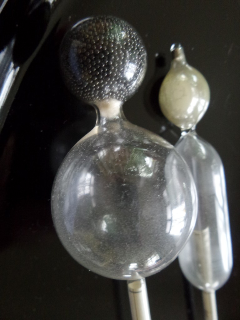 Ze had bedacht dat ze met de Valys taxi wel van deur tot deur naar het glasmuseum zou kunnen reizen. Prachtig plan! Wat ik zeer waardeer. Maar deze mevrouw telde inmiddels 89 jaren. Ik kan het niet over mijn hart verkrijgen dat iemand met zo’n hoge leeftijd 2X op een dag uren in de taxi moet zitten voor één museumbezoek. De afspraak werd gemaakt. In mijn vakantie zou ze met de Valys taxi naar Rekken komen, ze zou hier savonds de warme maaltijd gebruiken, overnachten en na het ontbijt (volgens het principe van vrienden op (zonder) de fiets) en de ochtendkoffie weer vertrekken naar huis. Zo gezegd zo gedaan. Deze kwieke dame is net zo gefascineerd door glas dan ik ben… Uit haar verzameling had ze enkele dubbele stukken meegebracht voor mij, te zien op bovenstaande foto.