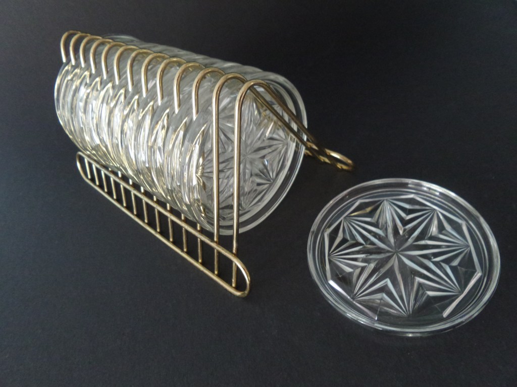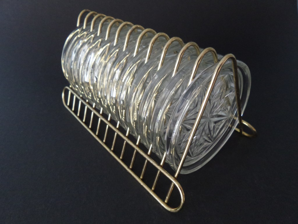 Nu ik deze foto post van een complete set onderzetters ben ik verbaasd hoe mooi dat eruitziet. Ook deze set kwam ik in mijn vakantie tegen bij een kringloop. Gekocht omdat het een klein prijsje was voor de hele set en de houder echt zo’n jaren ’60 houder is van goudkleurig metaal. Ik ben wel super verbaasd dat deze set de loop der tijden heeft overleefd (waarschijnlijk heeft het altijd achterin een kast gestaan en niemand heeft het gebruikt of misschien wel gekregen van die ene tante die maar één keer per jaar op bezoek komt en bij het serveren van het advocaatje met slagroom dan nog even de set op tafel gezet om te showen dat het nog steeds bestaat). Want het is een werkelijkheid erg onpraktische houder. Dat het niemand is overkomen dat het is vastgepakt en alles er uitgekiept is in duizend stukken op de grond is beland. Dank u wel, zuinige Nederlander!
