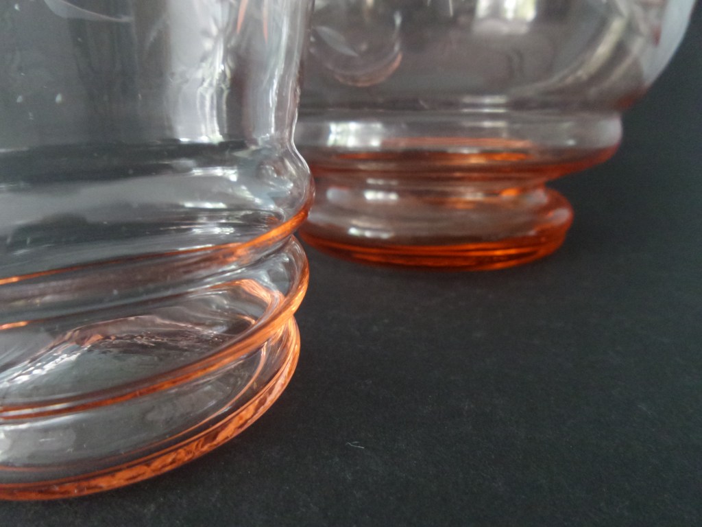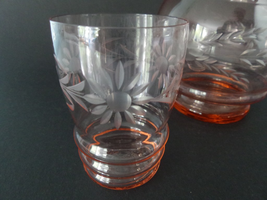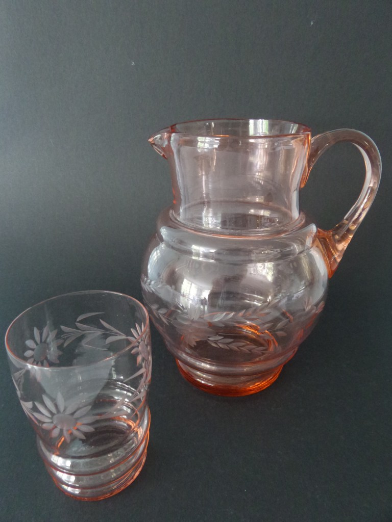 Deze foto laat de onderkant van een waterglas en een waterkan zien in roze glas. Hieraan is al te zien dat beide niet echt bij elkaar horen. Het waterglas heeft drie ribbels en de waterkan heeft twee ribbels. Maar de kleur is hetzelfde en een kniesoor die er over valt…