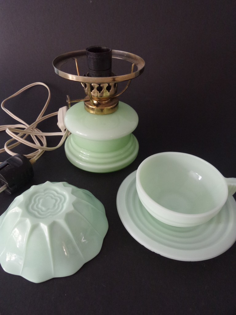 Onze dochter is geen verzamelaar en kan heel goed opruimen. Voor mij een groot voordeel. Want bovenstaande drie stukken komen uit haar inboedel. Ze vond haar huis te vol en er moest wat uit. Zo kwam er laatst een doosje glaswerk vanuit Den Haag naar de Achterhoek. Met leuke items. O.a. deze drie licht groene stukken. Bovenstaand lampje is niet meer compleet. Maar ergens stond nog een lampenglas in de kast en die past er wel op. Nu nog op zoek naar een lampje die in de fitting past. dat zal nog lastig worden omdat ik heb gezien dat er een lampje in moet met een bajonet aansluiting (die wordt er niet in geschroefd maar ingeklikt). Mijn oude naaimachine had ook zo’n lampje. En dan is het afwachten of deze het nog doet. Het is in ieder geval wel leuk om naar te kijken.