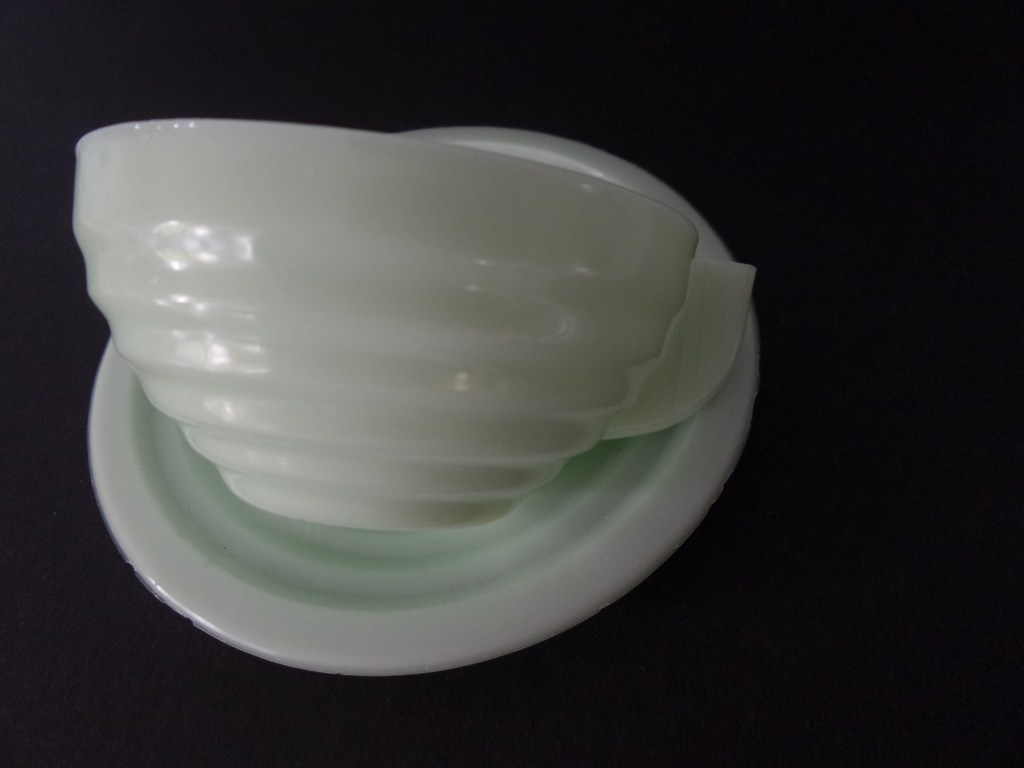 De kop en schotel is gemaakt in Frankrijk. Ze zijn er in lichtblauw en lichtgroen. Ergens in een doos heb ik ook nog enkele groene exemplaren. Zodra het glasmuseum meer in beeld komt komen deze ook wel weer tevoorschijn. Geduld is een schone zaak in deze.