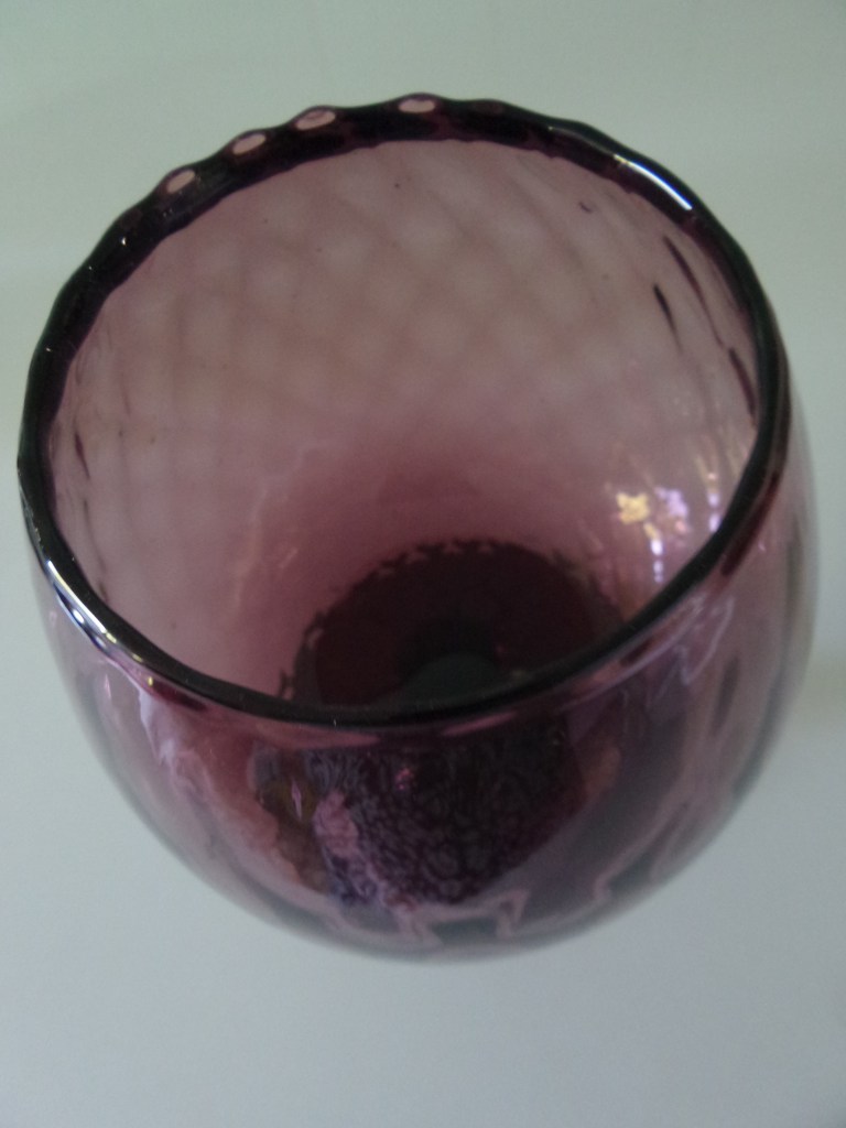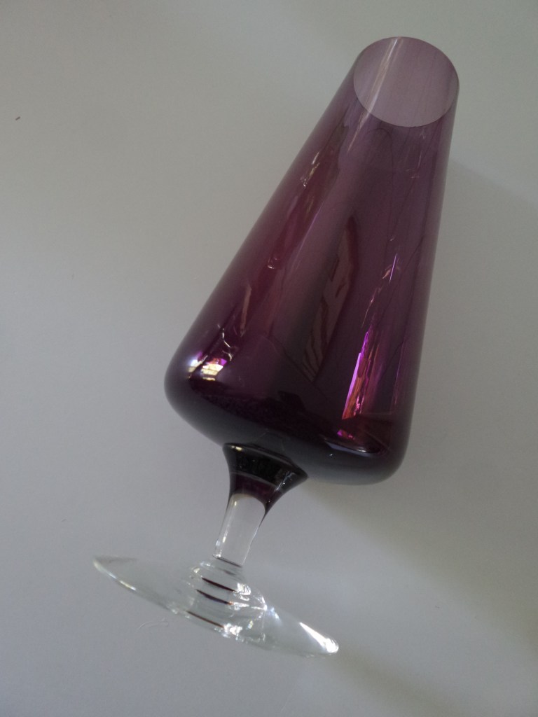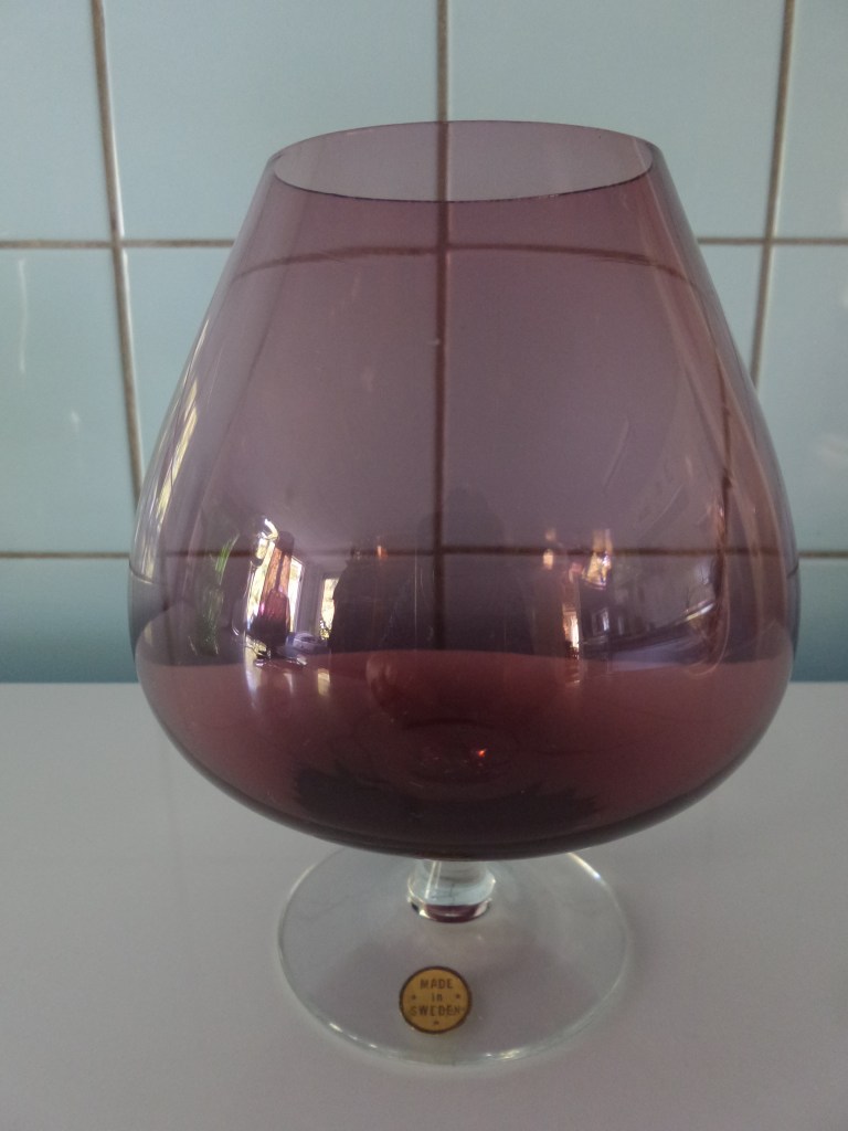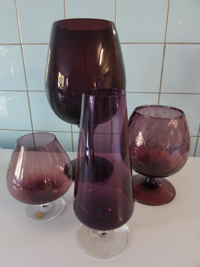 Donderdag purple day… Donderdagmiddag kleine kringloopronde gedaan, d.w.z. dat ik bij twee kringlopen ben geweest. Bij beide kwam ik paars glaswerk tegen dat ik niet kon weerstaan. Ook in mijn vakantie heb ik paas glas gekocht. Schijnbaar is de kleur uit en komt het overal uit alle hoeken weer tevoorschijn. Op een hoekkast in de woonkamer staan allemaal ‘cognacglazen’ in alle kleuren en maten. Dat is een collectie die gemaakt is in Italië en het wordt ook vaak verkocht als Murano glas (Murano is het glaseiland van Venetië). Maar deze vier paarse ‘cognacglazen’ komen daar in ieder geval niet vandaan. de achterste twee zijn te zwaar en dik ervoor. En de voorste heeft zelfs een sticker “made in Sweden”. Dus dat is Scandinavisch. Het Zweedse glas is ook wat dunner dan het Italiaanse glas en de rand is recht af. Terwijl het Italiaans glas vaak iets gebobbeld is aan de bovenrand zoals het rechter glas.