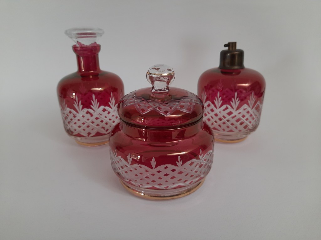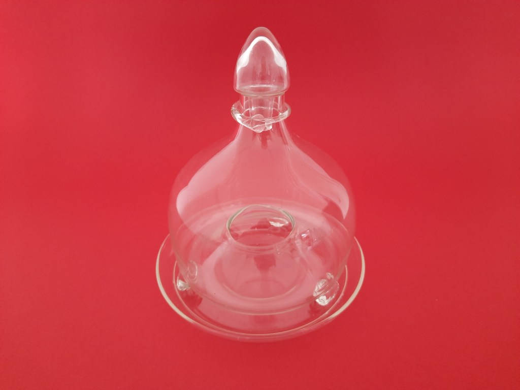 De nieuwe tentoonstelling is opgedragen aan Ivo Haanstra, iemand die met hart en ziel glas verzameld heeft. Via zijn familie en partner kwam zijn verzameling op mijn pad. In de blauwe tentoonstelling had ik al een kast ingericht met kabalt blauw glas uit zijn verzameling, deze is ook nu te zien. In de kast veel Blue Henri sputumflesjes. Ivo heeft onderzoek gedaan naar deze flesjes en daarover een boek geschreven. Dit boek ligt bij de Blue Henri’s in de vitrinekast. Maar alle andere vitrinekasten (en er boven op), zijn gevuld met glaswerk uit zijn verzameling. Zowel persglas als geblazen glas, zowel bijzonder als over de top. Maar stuk voor stuk andere dingen dan glaswerk uit mijn eigen verzameling. Daarom verdient deze tentoonstelling ook de titel Ode aan Ivo.