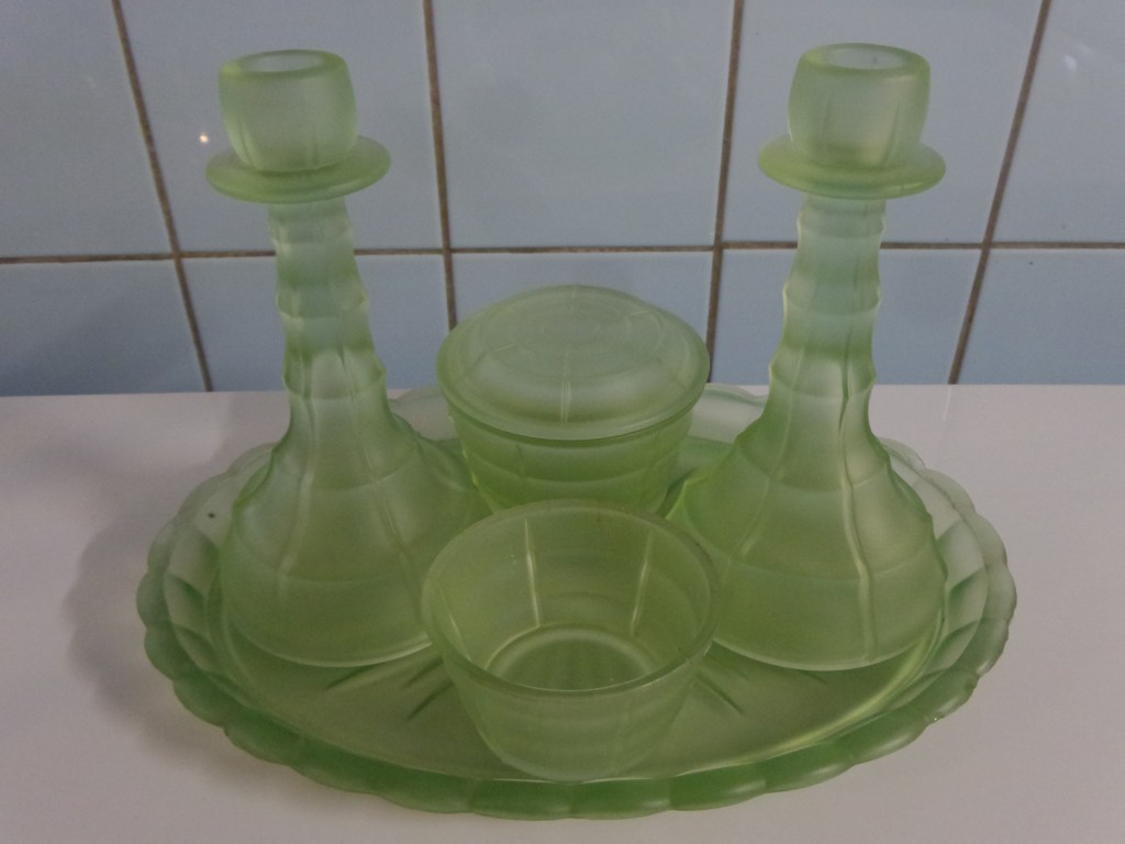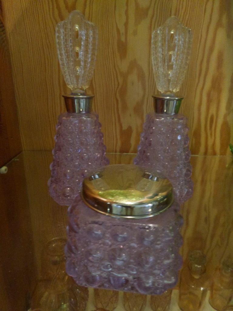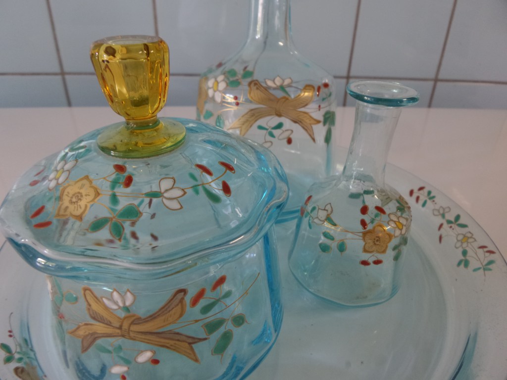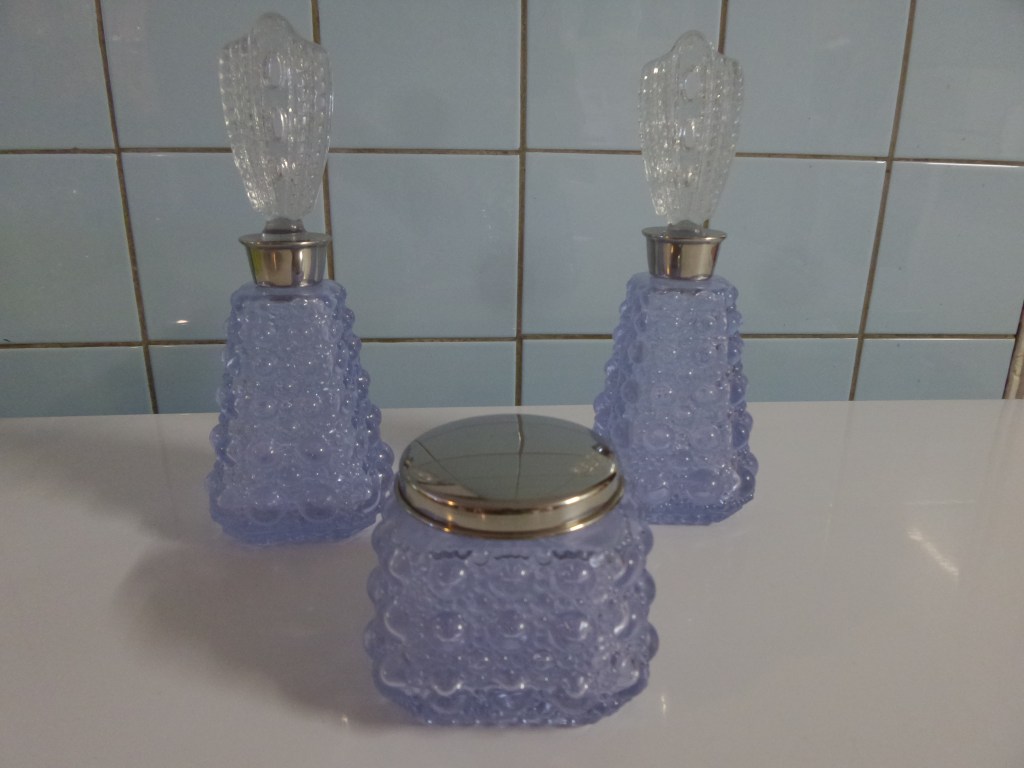 Toiletstellen zijn niet alleen gemaakt van doorzichtig glas, maar ook van gematteerd glas (satijnglas) zoals op deze foto te zien is. De opaline stellen heb ik al in een eerdere blog laten zien. Het verschil tussen opaline en gematteerd is dat door het laatste meer licht kan vallen dan door het opaline glas.