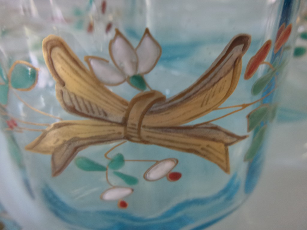 Deze prachtige set is beschilderd met emailleverf, wat ook in het glas gebrand is. Het goud is erop geschilderd. Goudverf kan de hoge temperaturen van het glas niet aan, daardoor is de goud versiering op glas altijd kwetsbaar. Als er veel gepoetst is, verdwijnt langzamerhand al het goud en ook de chique uitstraling van de set.