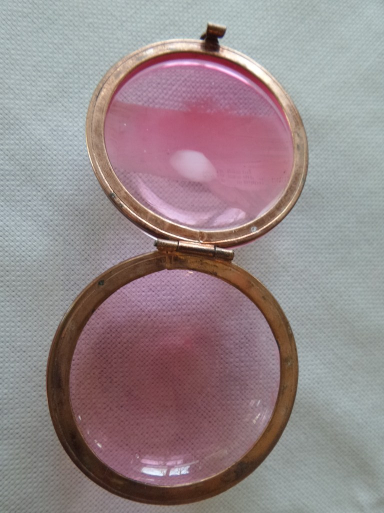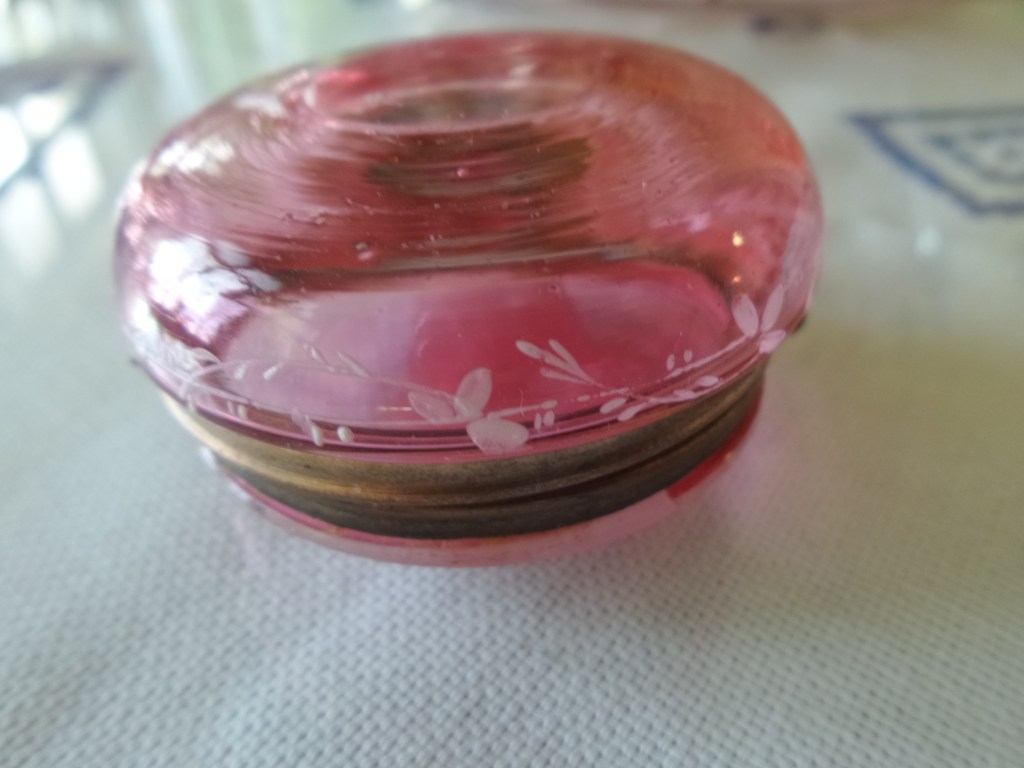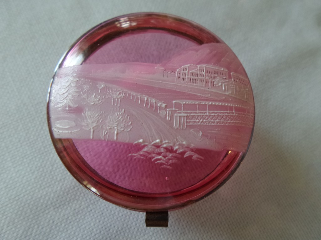 Het is een klein doosje van cranberry glas. Rozerood glas wordt zo genoemd. Dit doosje heeft een schildering in wit email op het doosje. Als we goed kijken dan zien we een landschapje met een rivier met brug en hoge huizen. Ik heb het doosje meegenomen naar kunst en kitsch en de taxateur vertelde dat dit doosje gemaakt is als souvenir. Waarschijnlijk komt dit doosje uit een kuuroord vandaan, gezien de afbeelding. Wanneer duidelijk is welke plaats op het doosje staat dan stijgt de waarde ervan. Maar helaas kan ik niet achterhalen welke plaats hier is afgebeeld.