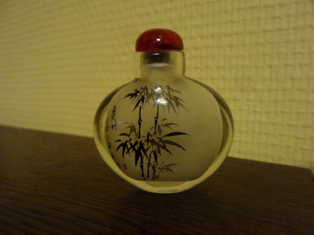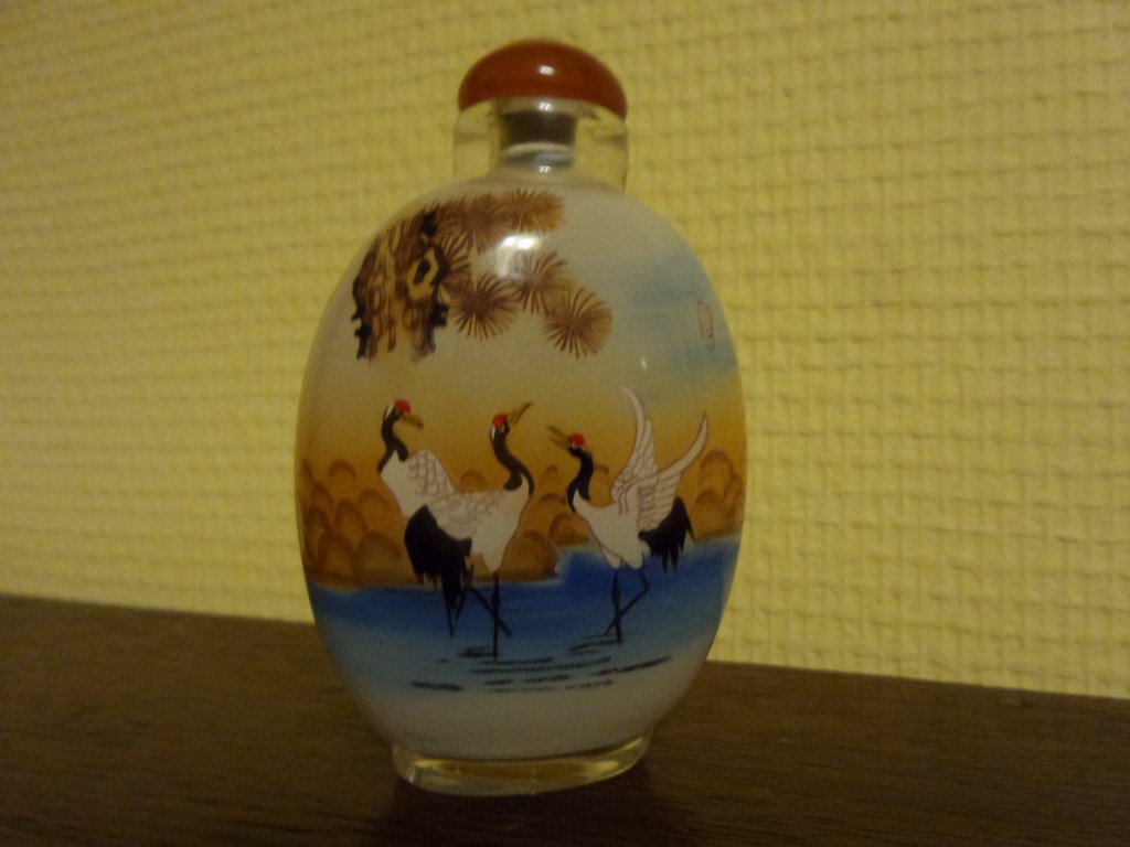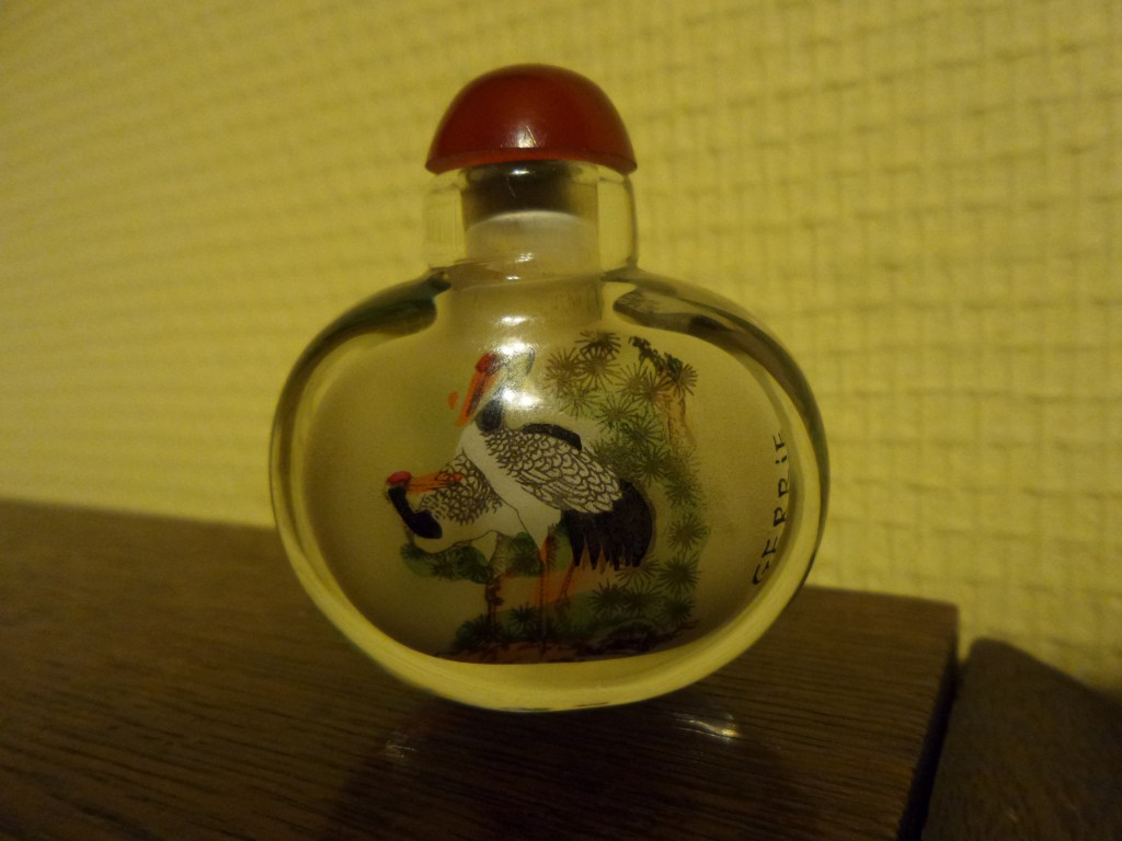 Bovenstaand flesje is een zogenaamde snuff bottle. De snuff bottles komen uit China. Ze waren vroeger gevuld met snuiftabak. Er is een periode in China geweest dat het roken van tabak verboden was, maar het gebruik van snuiftabak was toegestaan omdat men daar een medicinale werking aangaf. In China werden de snuff bottles gemaakt van veel verschillende materialen. Maar tegenwoordig zijn ze vooral te koop als souvernir.