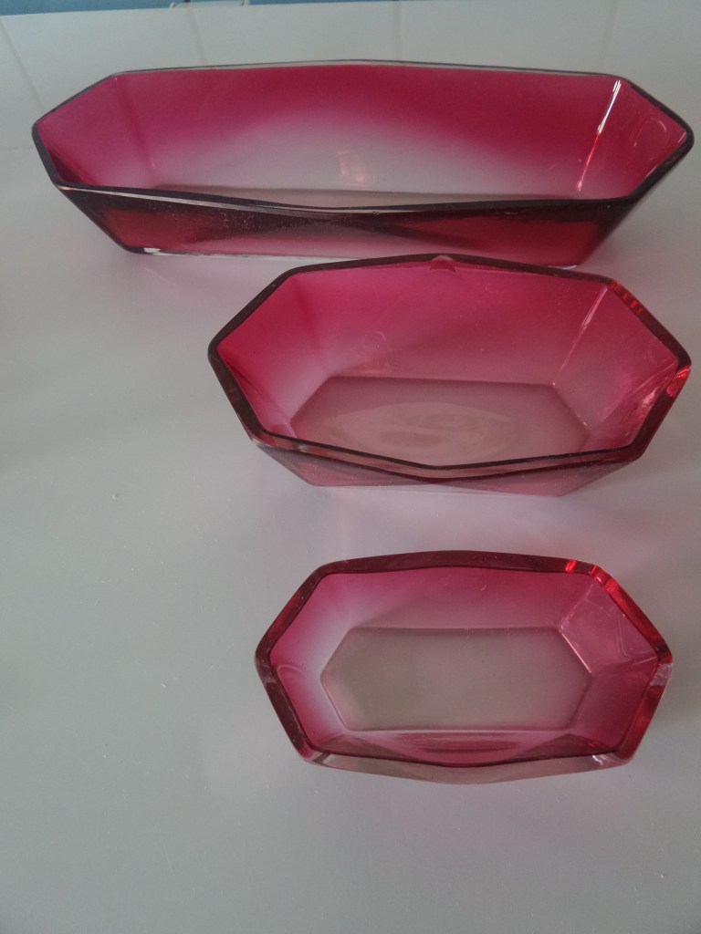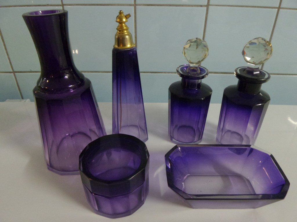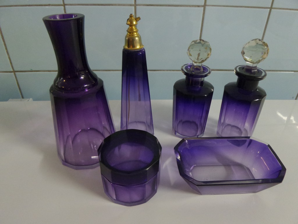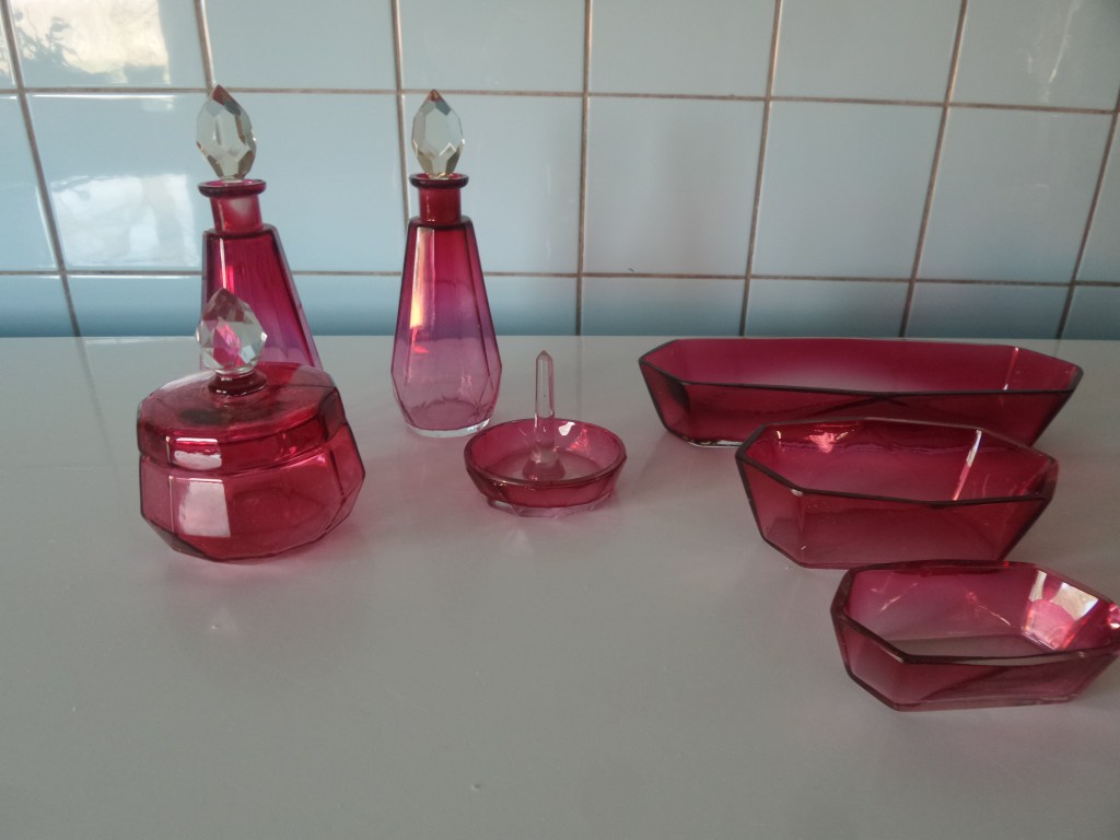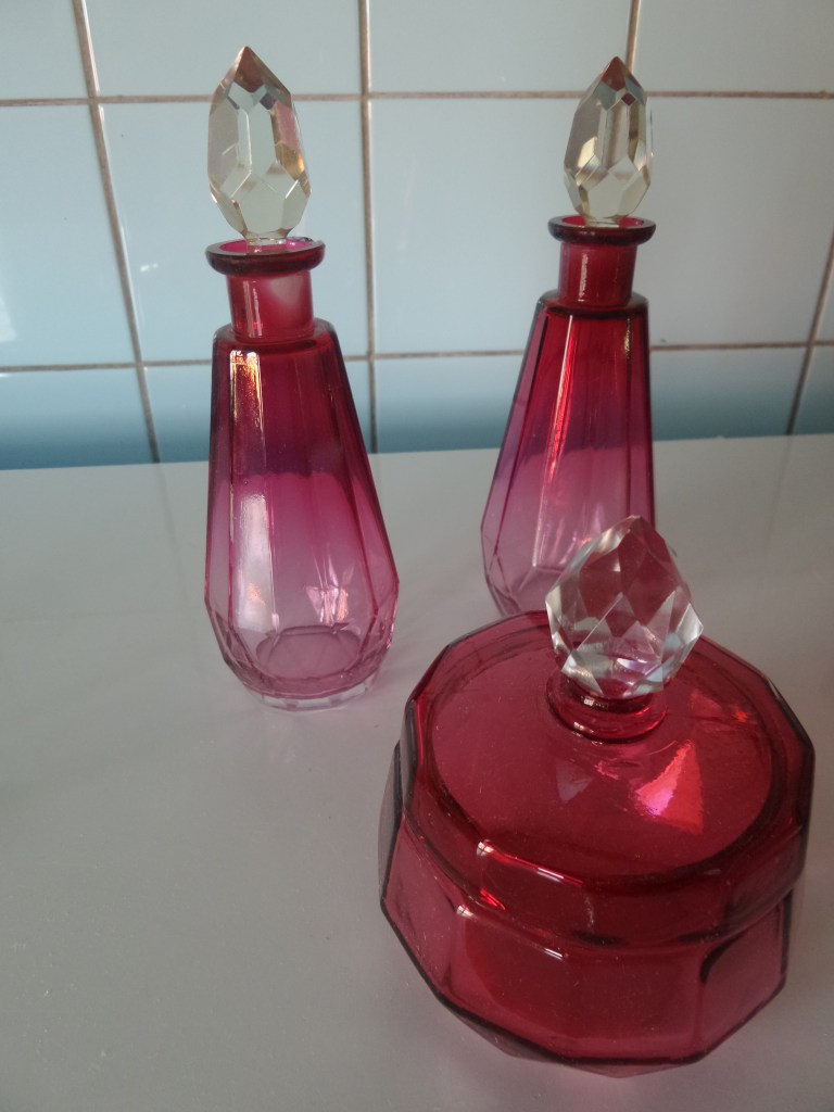 Onlangs ben ik in het bezit gekomen van dit mooie toilettafel stel. Het is prachtig uitgevoerd in zogenaamd cranberry glas, genoemd naar de kleur van cranberries. In het Nederlands wordt het ook wel robijnglas genoemd. Om deze robijnrode kleur te kunnen maken is goud nodig. Er worden kleine hoeveelheden goudpoeder opgelost in koningswater bij het gesmolten glas gevoegd. Koningswater is een 3:1 mengsel van geconcentreerd zoutzuur en geconcentreerd salpeterzuur.