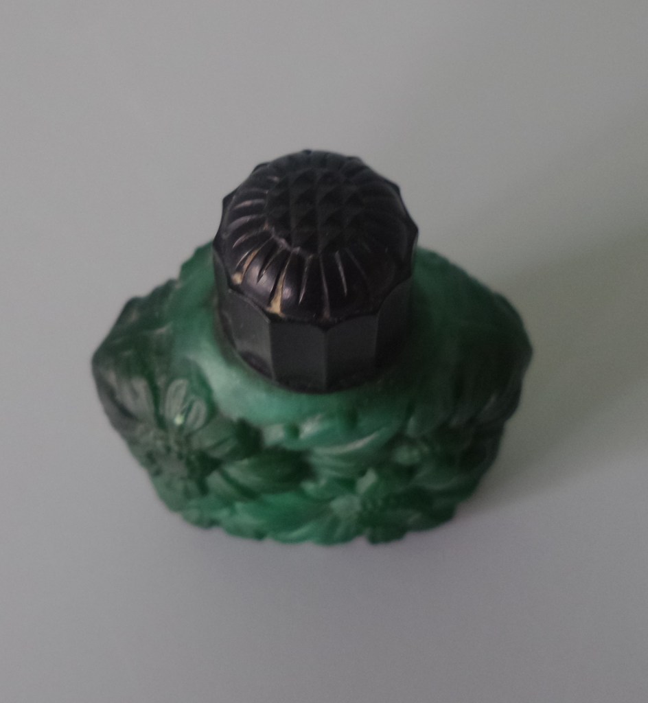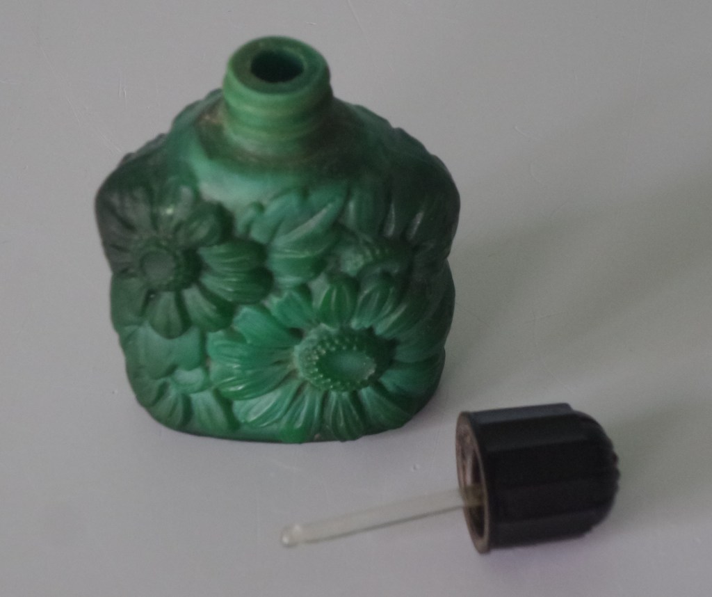 Vandaag een mooi klein parfumfles ook met een bloemenmotief. Inmiddels bezit ik drie kleine malachiet glazen parfumflesjes. Het mooie aan dit flesje is ook het bakeliet dopje wat hetzelfde motief heeft als het flesje. Aan het dopje zit een glazen pipetje vast voor het druppelen van de parfum.