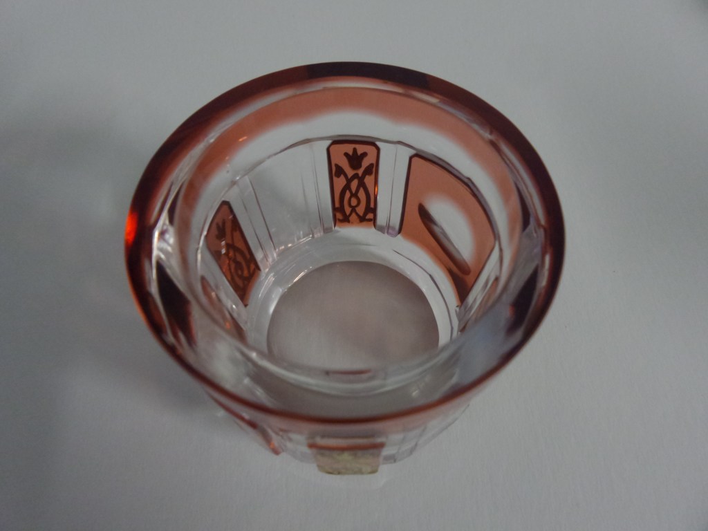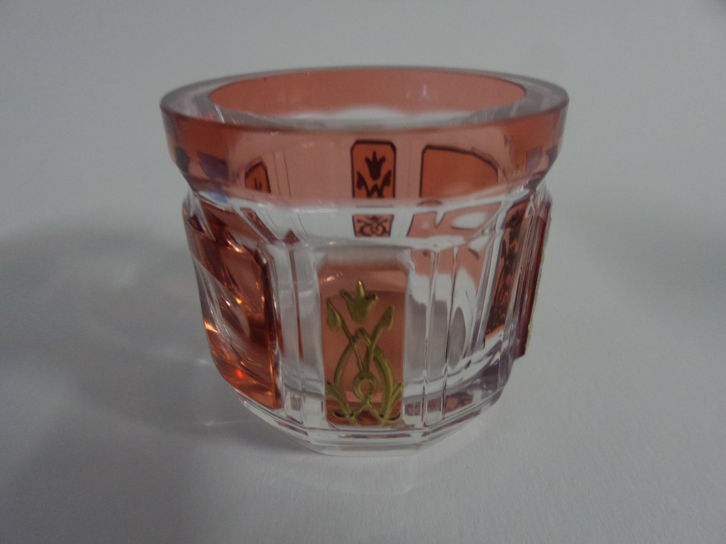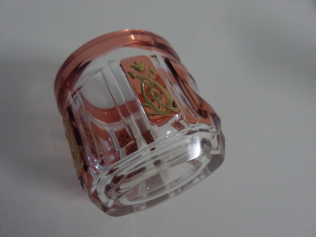 Ook dit kristallen bakje is van uberfang/overlay gemaakt. Het zalmroze is rondom weg geslepen waardoor het blanke kristal beter zichtbaar wordt. De gouden beschildering is volgens mij het logo van het parfummerk. Maar misschien kan iemand mij daar ooit wat meer over vertellen.