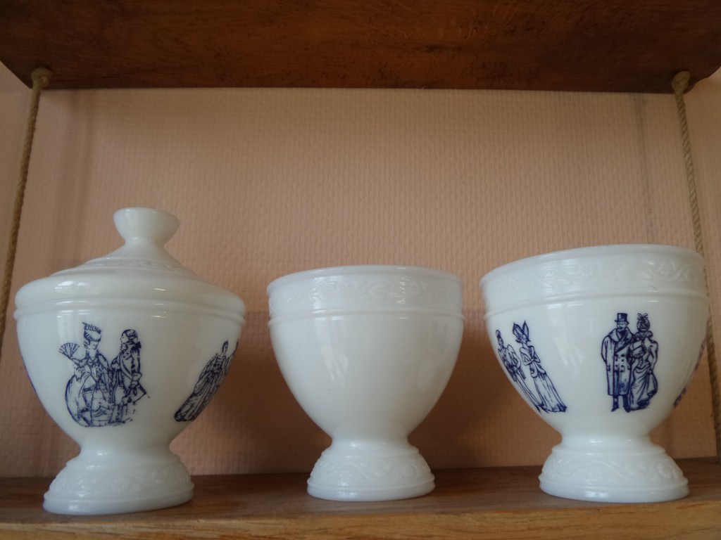 Soms stond de set op een tableau zoals hier er ook één van te zien is. deze set wordt gecompleteerd met een ringen bakje, rechtsonder op de foto. Zo noemt men deze, maar het is nog onduidelijk of daar deze wel ooit voor bedoeld is. In Frankrijk had men vroeger ronde zeep met een gat erin. Het kan ook zijn dat het bakje daarvoor bedoeld is.