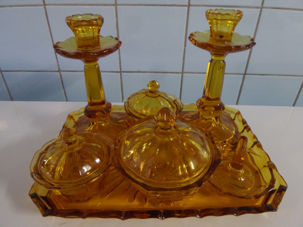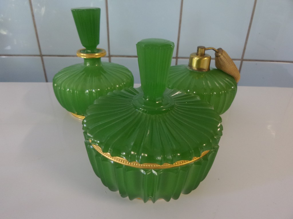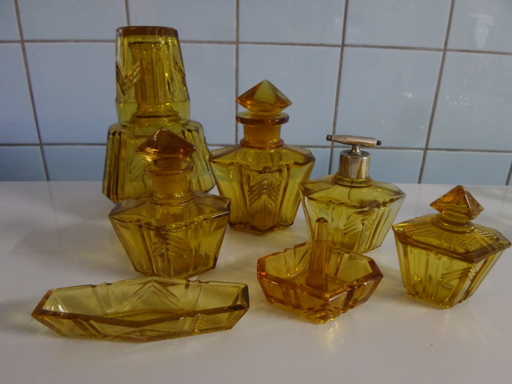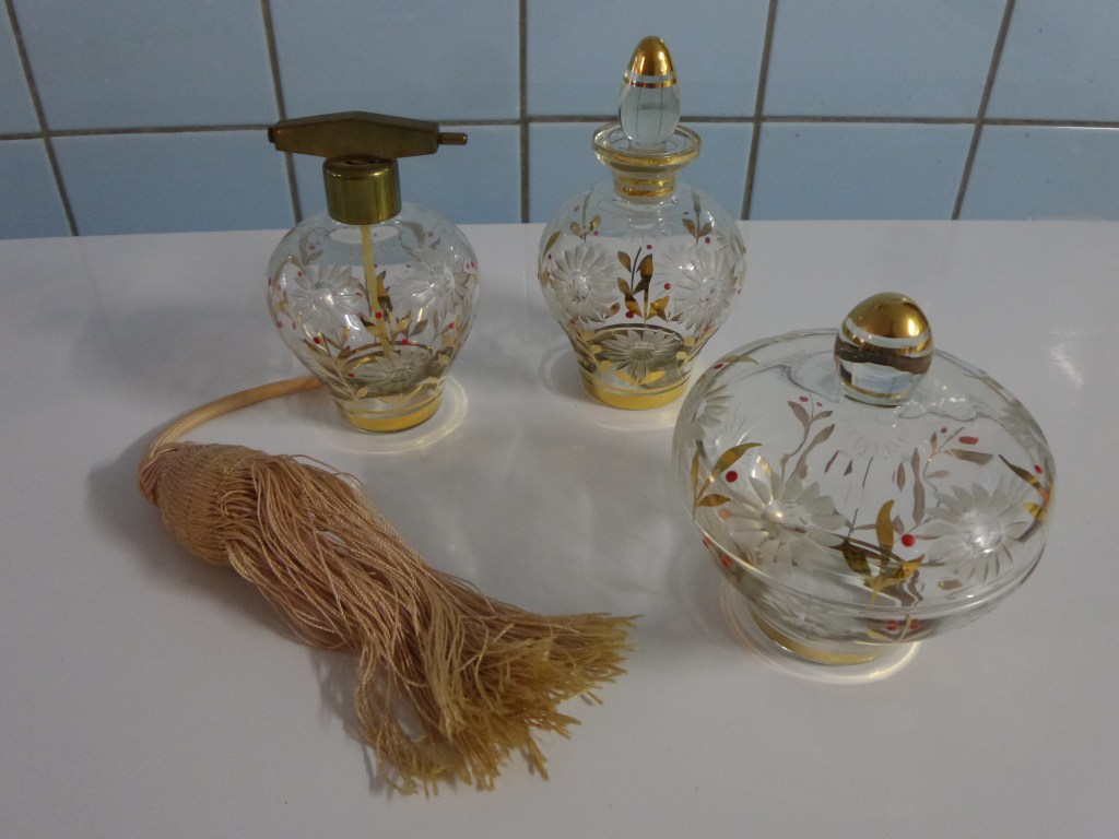 In mijn bijkeuken staat een grote kast vol met parfumflessen en aanverwante glazen voorwerpen. Zo ook het bovenstaande toiletstel of parfumstel. Iedere dame van stand had vroeger wel zo’n set op haar toilettafel in haar boudoir staan. Zo’n set bestond dan ook uit meerdere bij elkaar passende onderdelen. Zoals parfumflacons, wattenpotten , kammenbakje en haarspeldenbakje.