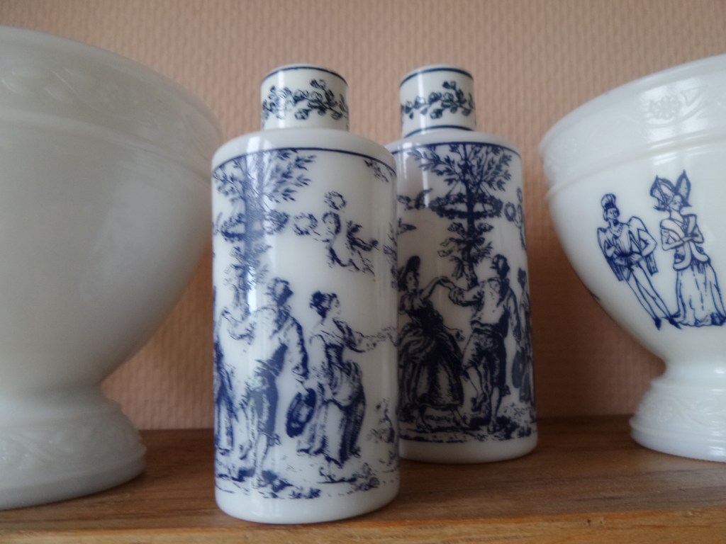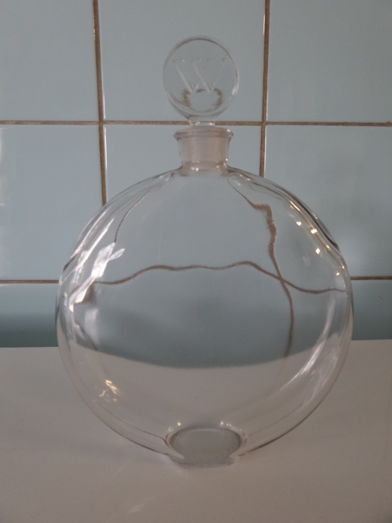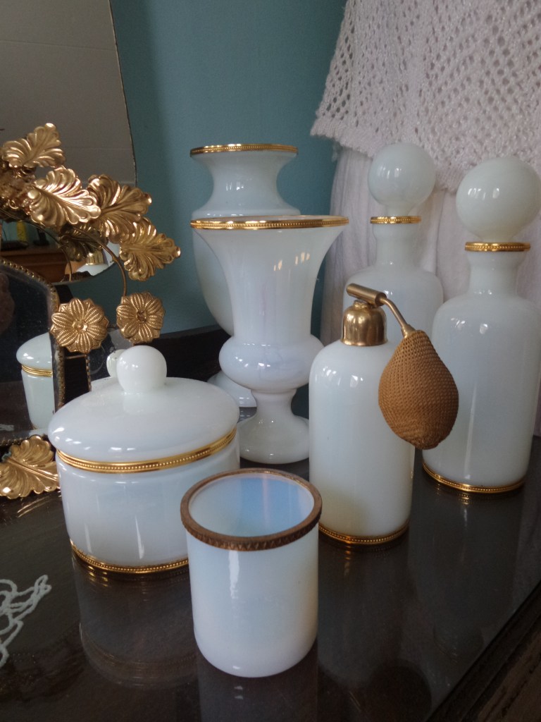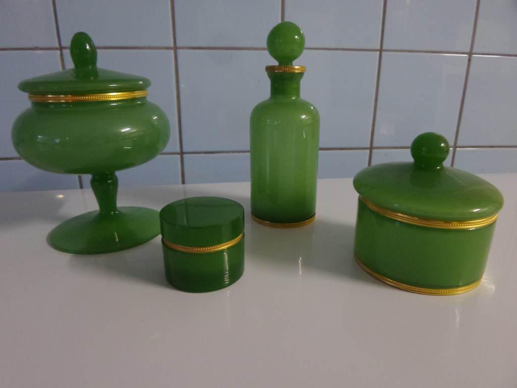 In mijn bijkeuken staat een grote kast vol met parfumflessen en aanverwante glazen voorwerpen. Zo ook het bovenstaande toiletstel of parfumstel. Iedere dame van stand had vroeger wel zo’n set op haar toilettafel in haar boudoir staan. Zo’n set bestond dan ook uit meerdere bij elkaar passende onderdelen. Zoals parfumflacons, wattenpotten , kammenbakje en haarspeldenbakje.